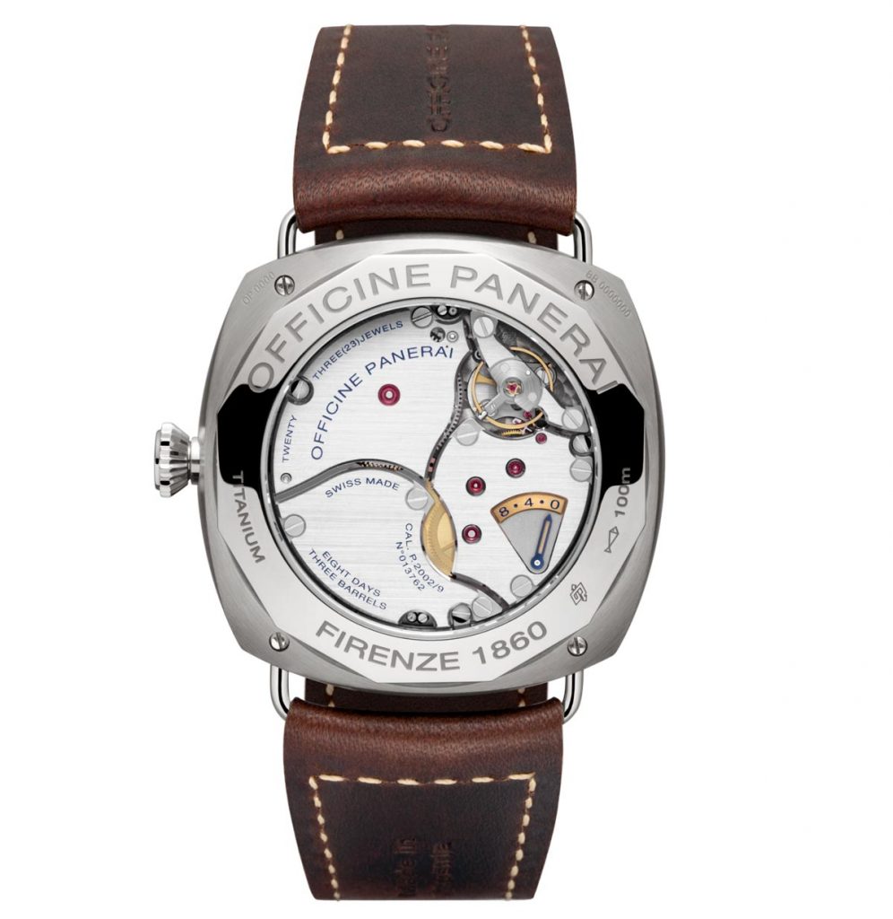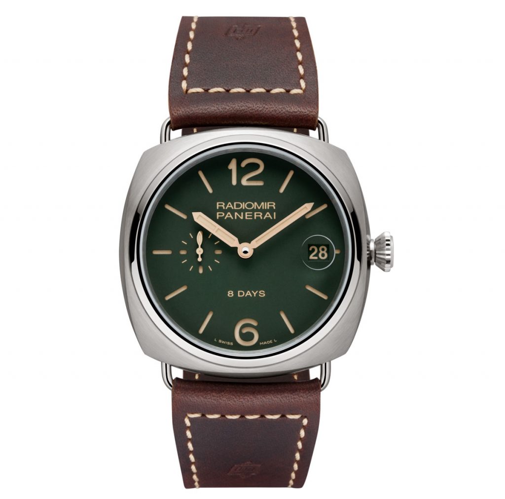 The PAM 735 Panerai Radiomir 8 Days Titanio has a 100m water resistance and wears on a dark brown strap stamped with Panerai logo.