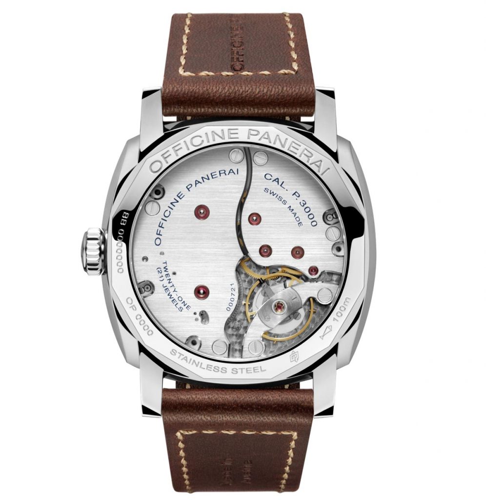 The PAM 736 Panerai Radiomir 1940 3 Days Acciaio has a water resistance of 100m and wears on the same dark brown strap stamped with Panerai logo.
