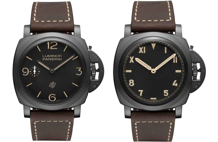 The two new Luminor 1950 3 days Titanio DLC differ from each other in the dial, which in both cases is protected by a rounded crystal. One version (PAM00617) has the black dial with the classic Panerai design, with large bar markers and figures, the seconds counter at 9 o’clock, the OP logo and the traditional sandwich construction. By contrast, the other model (PAM00629) has a black dial with a combination of Roman and Arabic numerals and graphic markers; this variant is known as the California dial and is much sought-after by collectors because it reproduces the design of the first Panerai watch in history, the Radiomir of 1936.