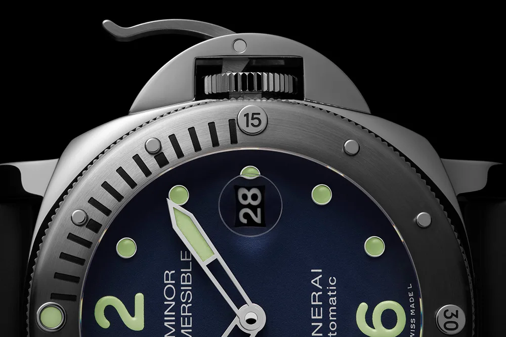The Panerai Luminor Submersible PAM731 also sports a blue dial instead of a black one like the PAM01024. Personally, a blue dial is a distinguishing feature of a diver’s watch so I’m quite happy with Panerai’s choice. The design is original presenting the time with a sub-seconds at 9 o’clock and the date at the traditional 3 o’clock. The cyclops magnifier on the sapphire crystal displays the date very legibly. We can also see the familiar skeletonized hour and minute hands coated in Super-LumiNova. The seconds hand and the indices are also covered in the mentioned material. Overall, the legibility is superb.