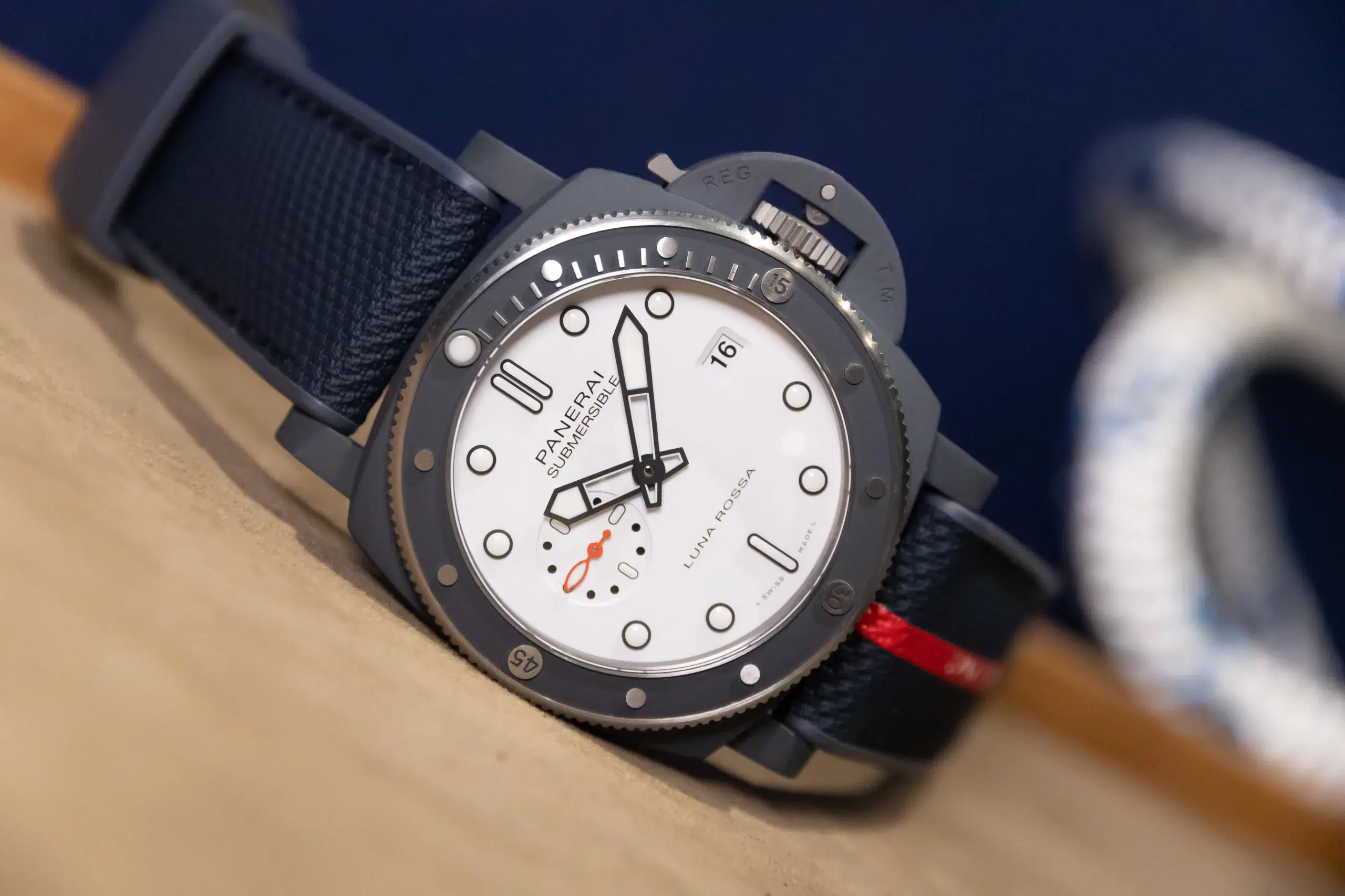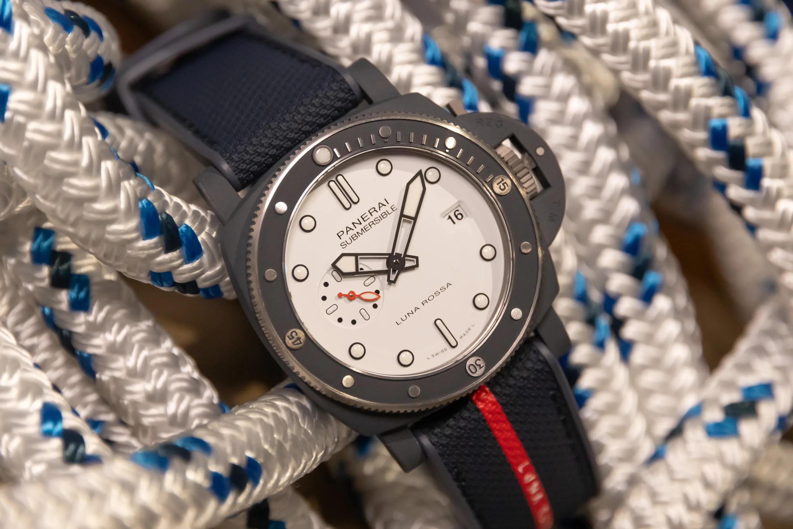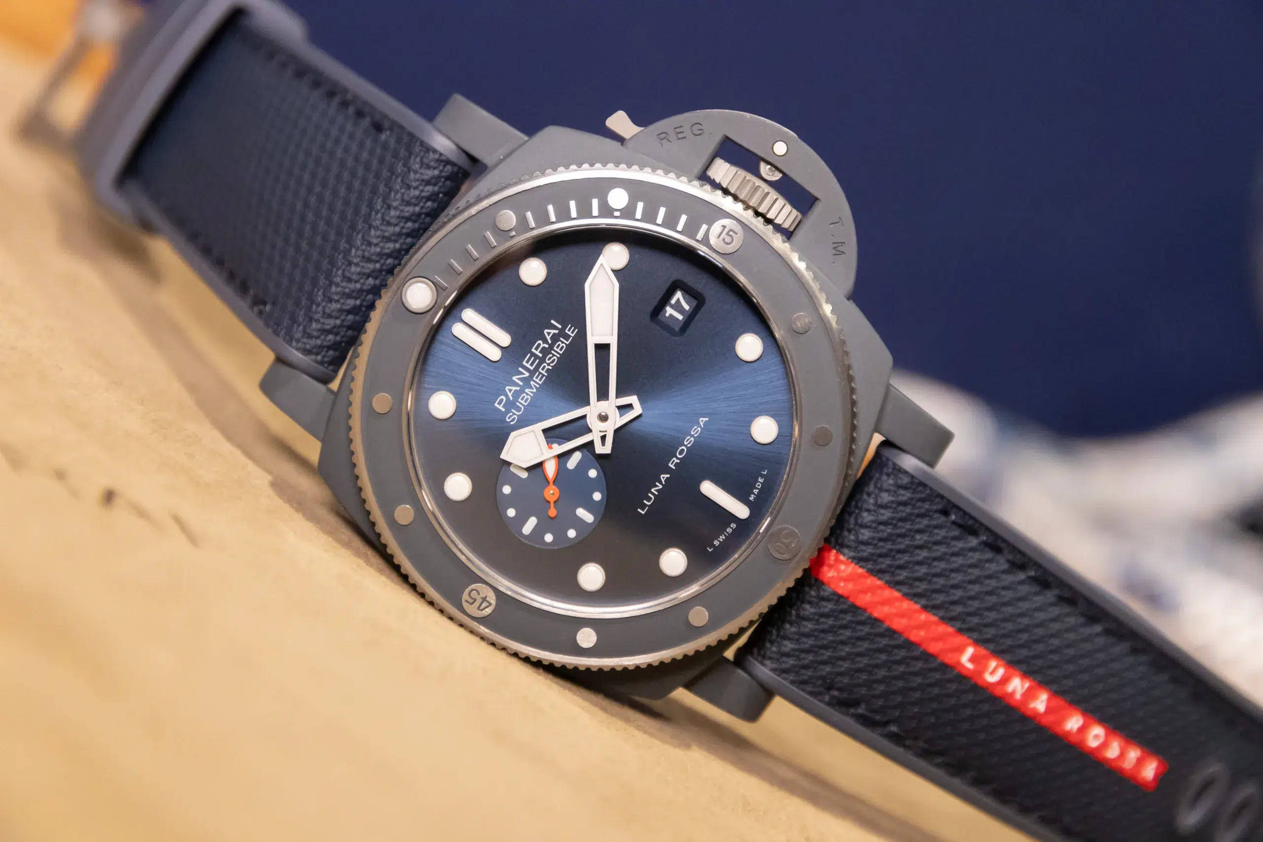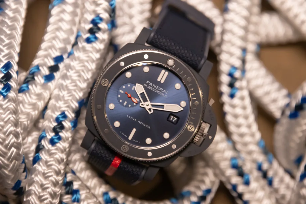 The Submersible QuarantaQuattro Luna Rossa Ti-Ceramitech boasts a revolutionary case material. Panerai’s “Ti-Ceramitech” is a lightweight (44% lighter than steel) and ultra-tough titanium alloy boasting a beautiful blue hue.Â