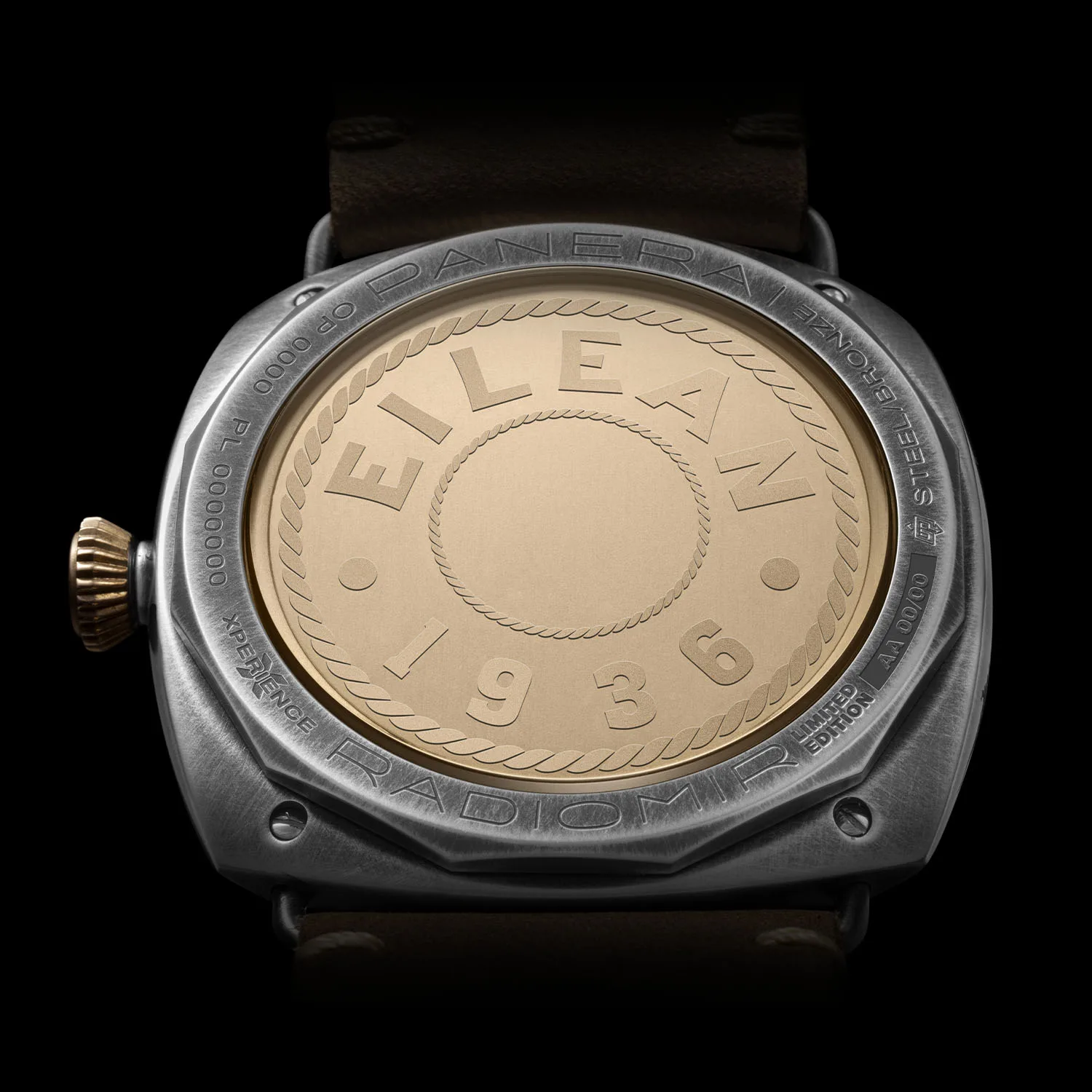 A 45mm x 14.5mm cushion shaped stainless steel case with 100 meters water resistance screams signature Panerai while featuring burnished finish, achieved through a PVD treatment followed by hand brushing. Panerai has incorporated actual bronze elements salvaged from the yacht’s restoration, this specialized bronze is composed of copper and tin and forms the bezel, crown, and caseback medallion, engraved with the vessel’s name and the year 1936. The left side of the case is also engraved with “Eilean 1936” alongside a dragon emblem taken from the yacht’s hull.