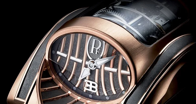 “Ah, if it’s anything like the Hublot it’ll be hidden in all of those barrels somehow” I hear you say. Well, it only shares the horizontal design aspect with the Hublot, and the automobile link of course. Unlike the Hublot, the Bugatti Mythe by Parmigiani displays the time as an analogue clock mounted to the end of the watch, looking like it belongs on the dashboard of a Veyron, rather than on the end of the watch itself. The face is an oval shape, the same as the EB logo and has both vertical and horizontal lines running across it that are designed to be reminiscent of the metalwork in the front grilles on the Bugattis of old with short and wide lancet hands with some lume applied. However, it’s design does slightly remind you of the stitches on a American football. And let’s not forget that Ford has an oval shaped logo too, luckily Parmigiani thought of that too as it’s put the EB logo on there too. Isn’t that thoughtful?