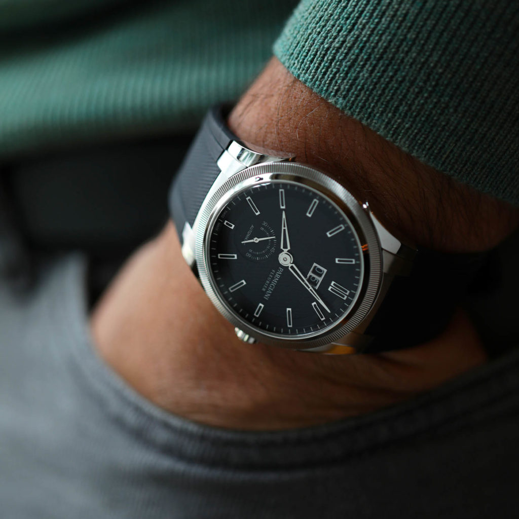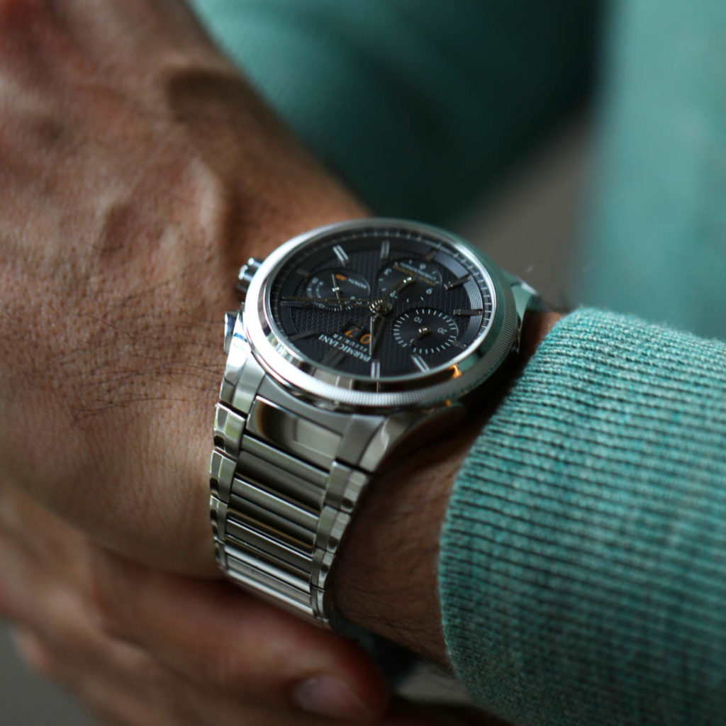 The chronograph version of this watch is being released at the same time. It’s called the Tondagraph GT, and it combines an annual calendar with a chronograph in an ambitious and yet aesthetically pleasing package. The Tondagraph GT is slightly larger than the Tonda GT, measuring in at 42mm x 13.7mm. Unlike the Tonda GT, this watch only comes in stainless steel. We might yet see a rose gold version in the future, so don’t give up on it yet! The elements of this more complicated watch blend together well, aided by the dashes of colour and the hollow hands which don’t obstruct the dial too much. Both the Tondagraph GT and the Tonda GT have a running seconds which appears similar to the pace timers you might see at the local swimming pool; it’s certainly a unique addition. Both of these watches are also 100m water-resistant, so swimming with them certainly isn’t out of the picture.