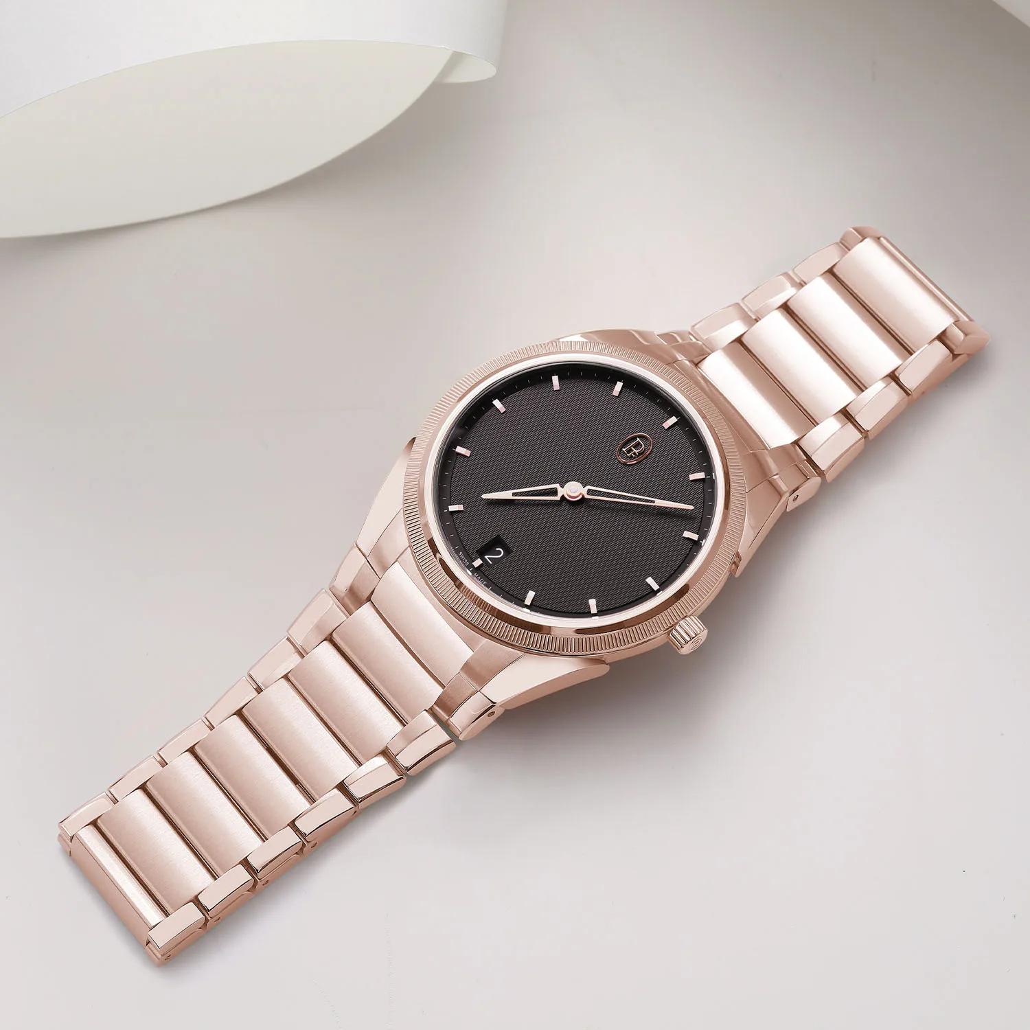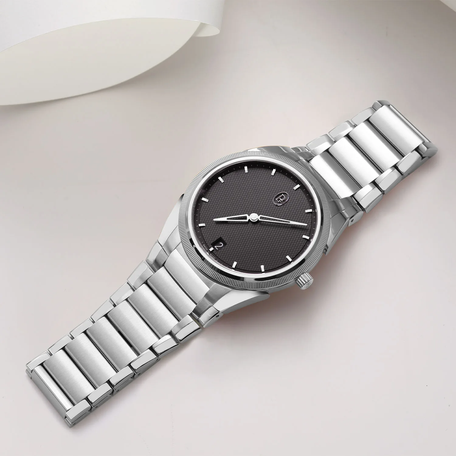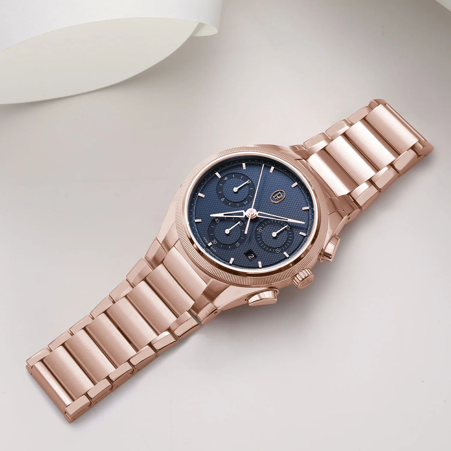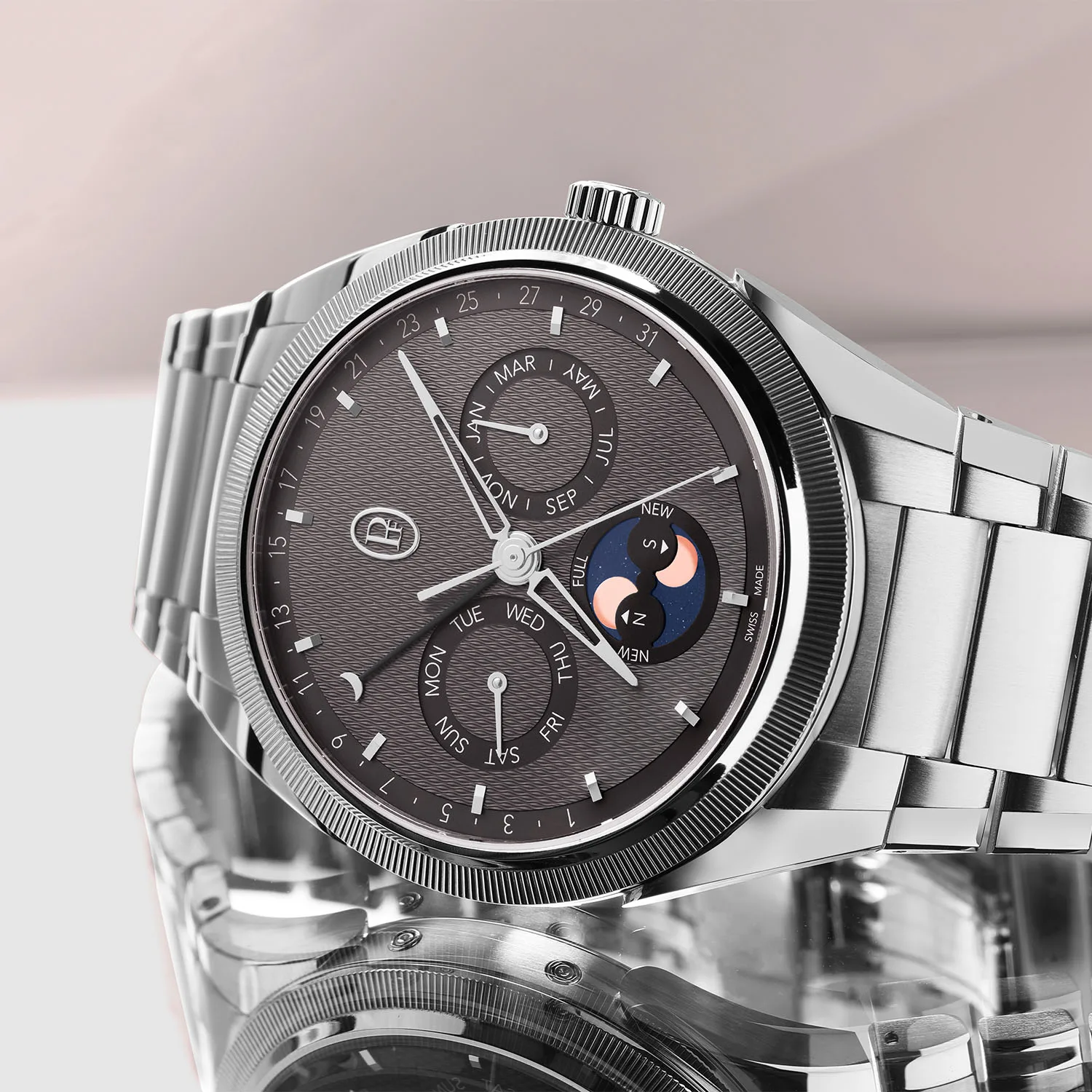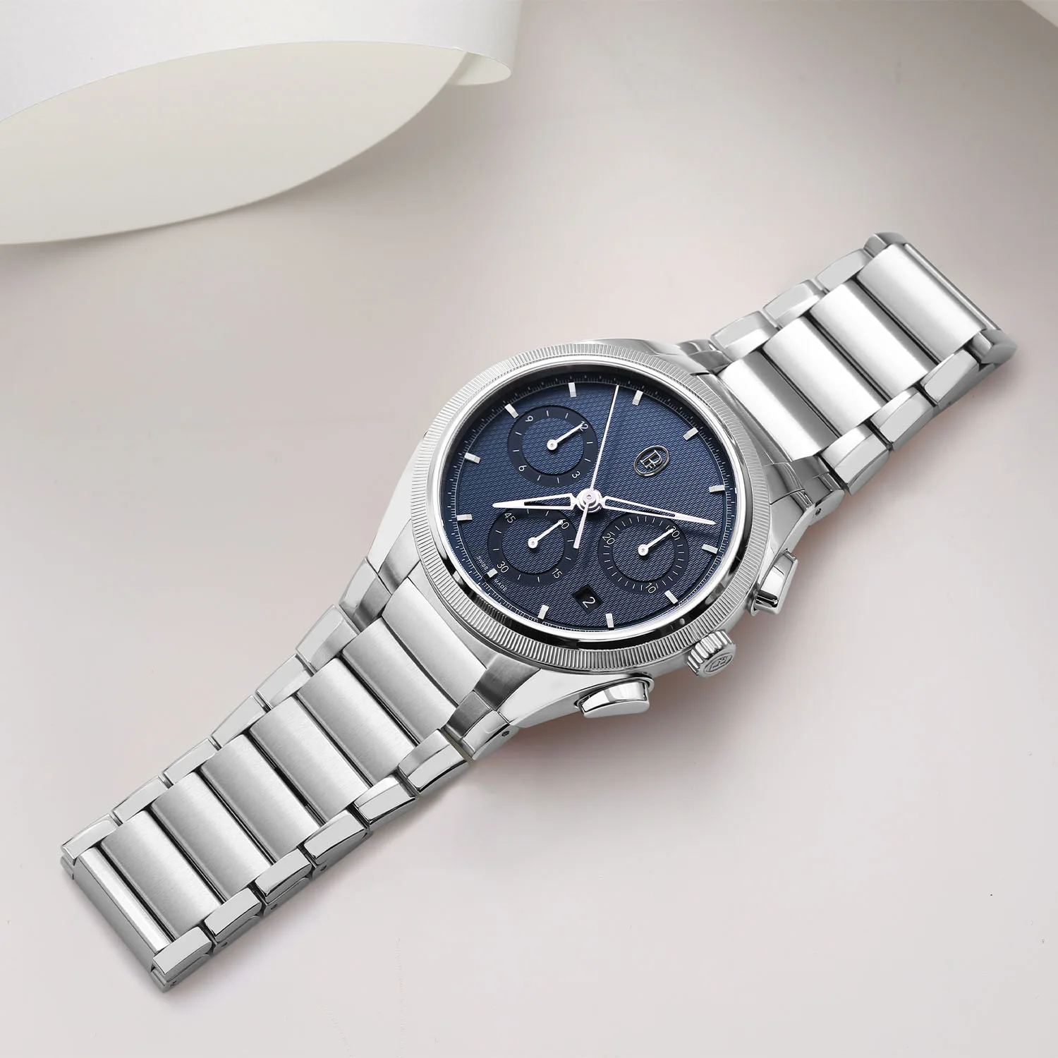 This watch sees the chronograph return and with it a chunkier 42mm x 12.4mm case. It has a depth rating of 100m (in fact, all four watches have a 100m water resistance rating) and a three-piece bracelet in your choice of metal. These watches get a deep blue dial colour instead of grey like on the PF Micro-Rotor, but they otherwise keep the minimalistic design cues. I wonder how many comments we’ll get about the date window at 4.30?