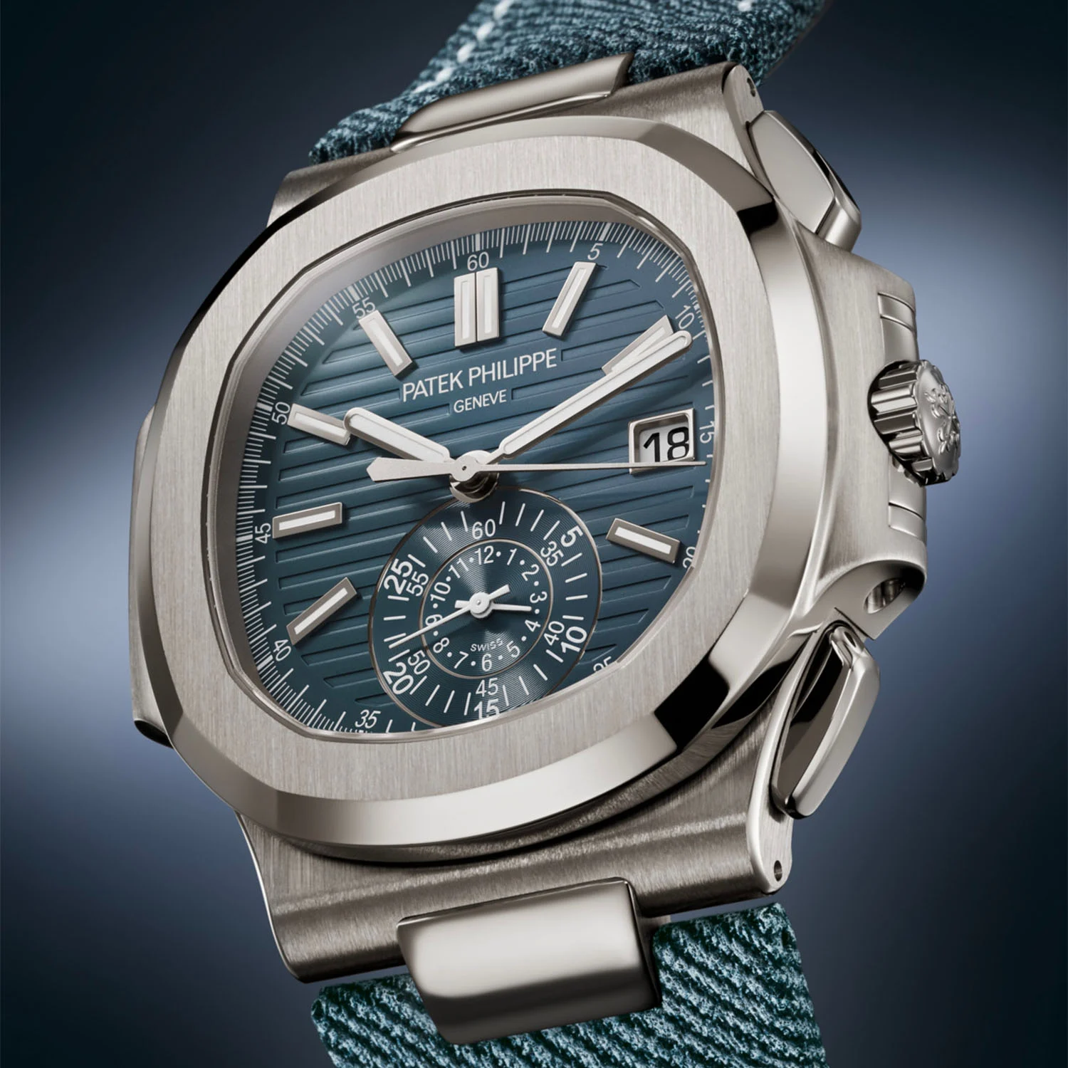 Patek offers two straps: a bold blue-gray denim pattern calfskin and a classic blue-gray fabric option. Both fasten with a white gold Nautilus clasp. The Ref. 5980/60G-001 costs EUR 78,300 and is available now.