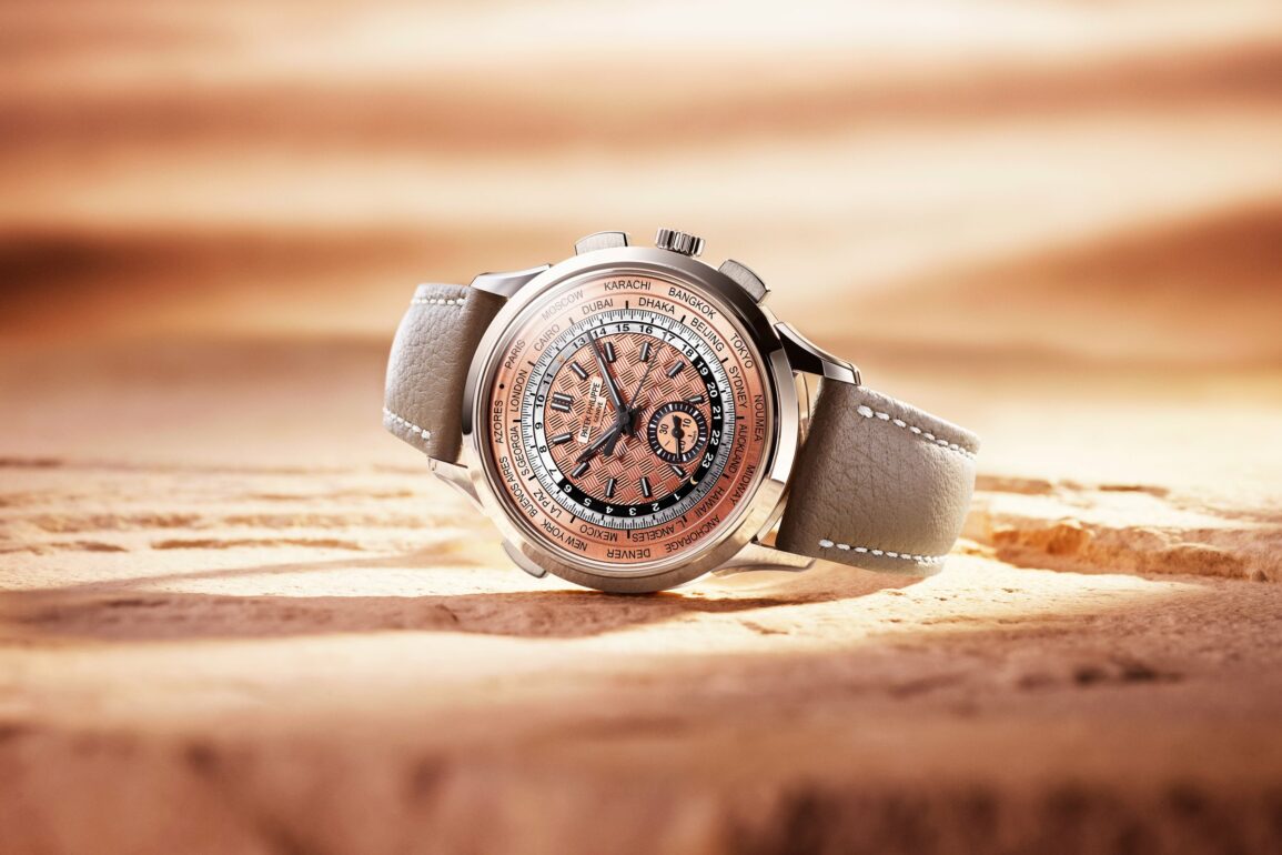 As the name suggests, the 5935A has World Timer and Flyback Chronograph complications. The world timer is a function designed to make it easier to read the time in all (main) time zones at a glance, not simply the time in a secondary timezone. This complication is more helpful now than ever in a world that is getting smaller all the time, especially useful in conjunction with the ease of a flyback chronograph. Presented in a steel case measuring 41mm x 12.75mm, the dial is of Rose gilt color with carbon motif. The gold-applied charcoal gray indices are present on the innermost ring and are applied with lume. The automatic movement CH 28-520 HU powers the timepiece, beating at 28,800 vph and offering a 55 hours power reserve. The water resistance is 30 meters. The timepiece comes on a leather strap with two options available, grained taupe and beige nubuck. It has a price tag of $63,870.