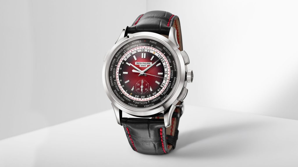 Right off the bat what steals the spotlight here is the hand-done red guilloche dial. The intricate combed pattern lends the watch a sophisticated and luxurious appeal, but what heightens the visual drama is the degrade effect. It begins with a deep shade of red at the center and takes an almost blackish red hue in the area surrounding the applied hour markers. Apart from the new color, the layout remains the same as the blue dial 5930G reference which was released at Baselworld 2016 and displays a host of information that includes chronograph minutes/seconds, and time across 24 cities around the world (Beijing replaced with Singapore for this limited edition). It is also worth noting that even with so much detail on offer, the face of the watch manages to remain highly legible.