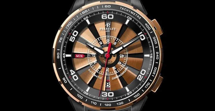 Incorporating a chronograph into a Turbine watch represented a challenge to which Perrelet has risen with impressive ingenuity. The additional function is clearly displayed on the dial of the Turbine Chrono automatic model without detracting from the singular identity of the collection. Perrelet has successfully given rise to this original creation featuring a series of cleverly superimposed effects.