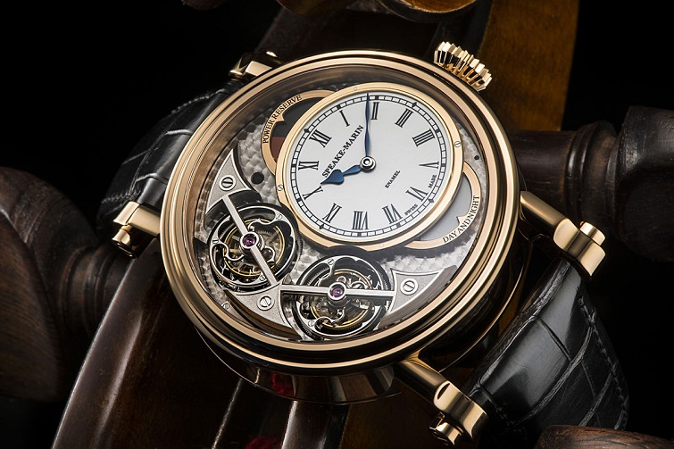 Two versions are being released one in white gold the other in rose gold which I prefer as really accentuates the tourbillons and dial more so. The large oven-fired enamel dial with roman numerals and rail-track minute markers round the outer edge hark back to dials of old pocket watches in its appearance. Speake-Marin typical blued-steel hands indicate the hours and minutes and are thin so as not to spoil the clean crisp dial much. Just above the dial is a power reserve indicator displaying the power by means of a cam-shaped disc that when fully wound opens to reveal the gears and mechanism below then slowly closing to reveal a red section when in need of winding. Below the dial and keeping the symmetry perfect is a day/night indicator.