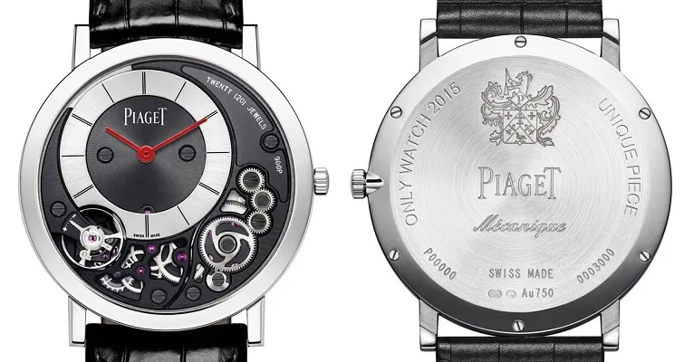 Participating in Only watch for the sixth time (bi-annually since 2005) Piaget comes to the party with an Altiplano 900P presented with red hands. Piaget are quoted as saying this is neither entirely a movement or exactly a case just both perfectly formed together. This Altiplano merges seamlessly both elements perfectly to achieve a record breaking slimness and I mean slim or even ultra-slim to be totally honest as this case is only 3.65mm thick. To put this into context 3.65mm is roughly the thickness of a steel bracelet!