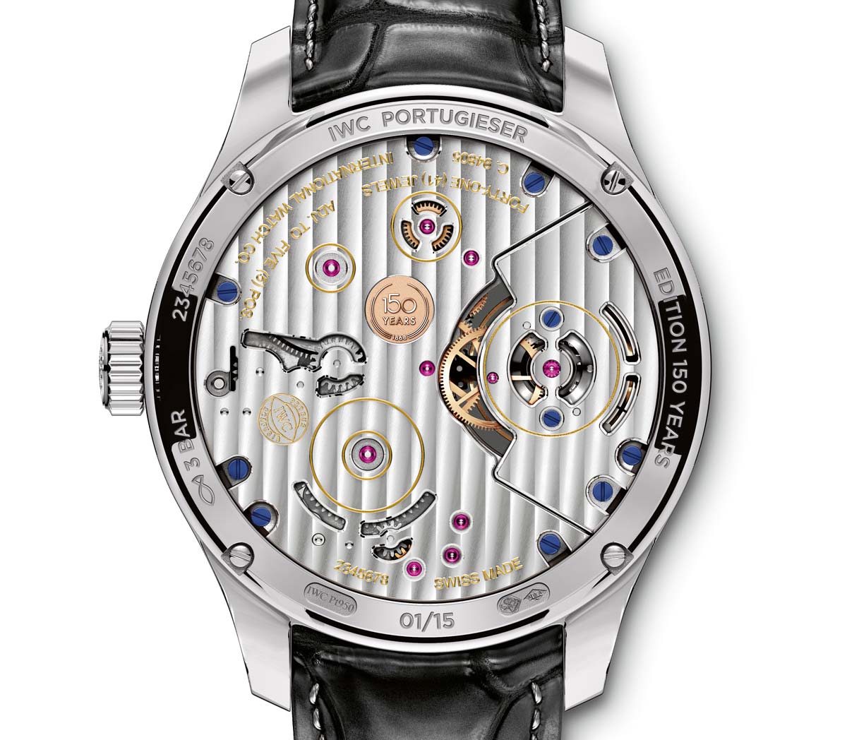 This watch is powered by IWC’s newly created hand-wound calibre 94805 that combines a constant-force tourbillon along with a perpetual moon phase display that only needs to be adjusted by 1 day after 577.5 years. The patented constant-force mechanism transmits an even amount of energy to the escapement wheel and that along with the tourbillon helps in achieving a high level of accuracy. This movement is a feast for the eyes as it has been exceptionally decorated using Côtes de Genève, Blued screws and beveling on bridges. The movement operates at a frequency of 2.5 Hz offering a staggering power reserve of 96 hours and also bears a medallion highlighting the 150th anniversary of the brand.