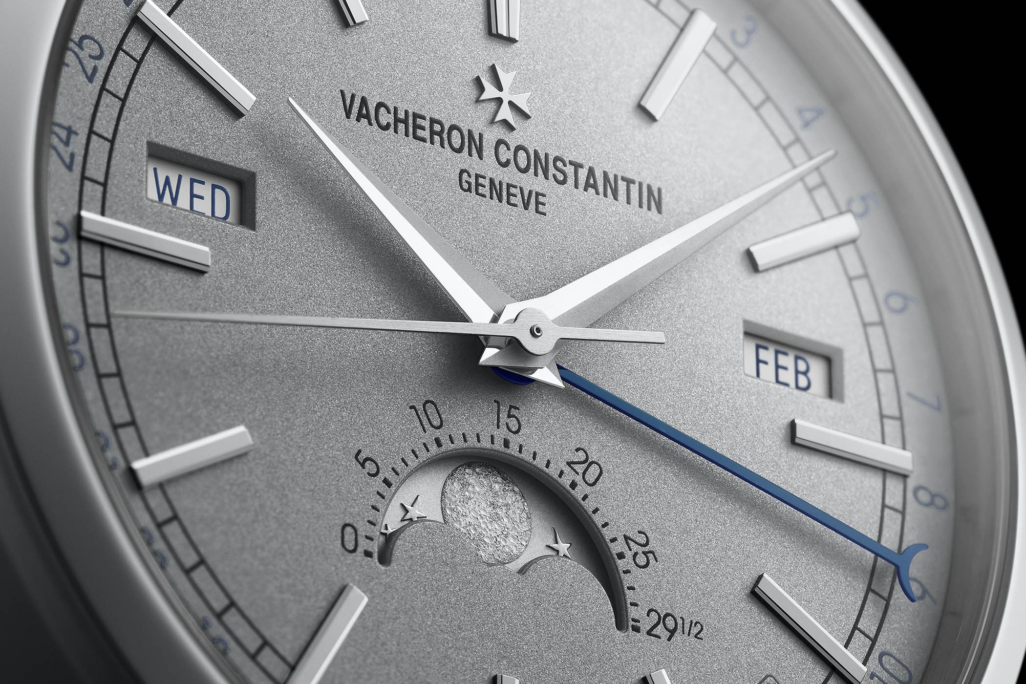 Unlike the original watches, the new complication positions the day and month indications at just above the 9 and 3 and adding a moon-phase indication at 6. Also worth mentioning is the modernity of the dial while remaining classic. The straight faceted indexes, the classic railroad track for the minutes and dauphine hands for the hours and minutes are all present. The central hand that indicates the date is also blued with a nice crescent tip.