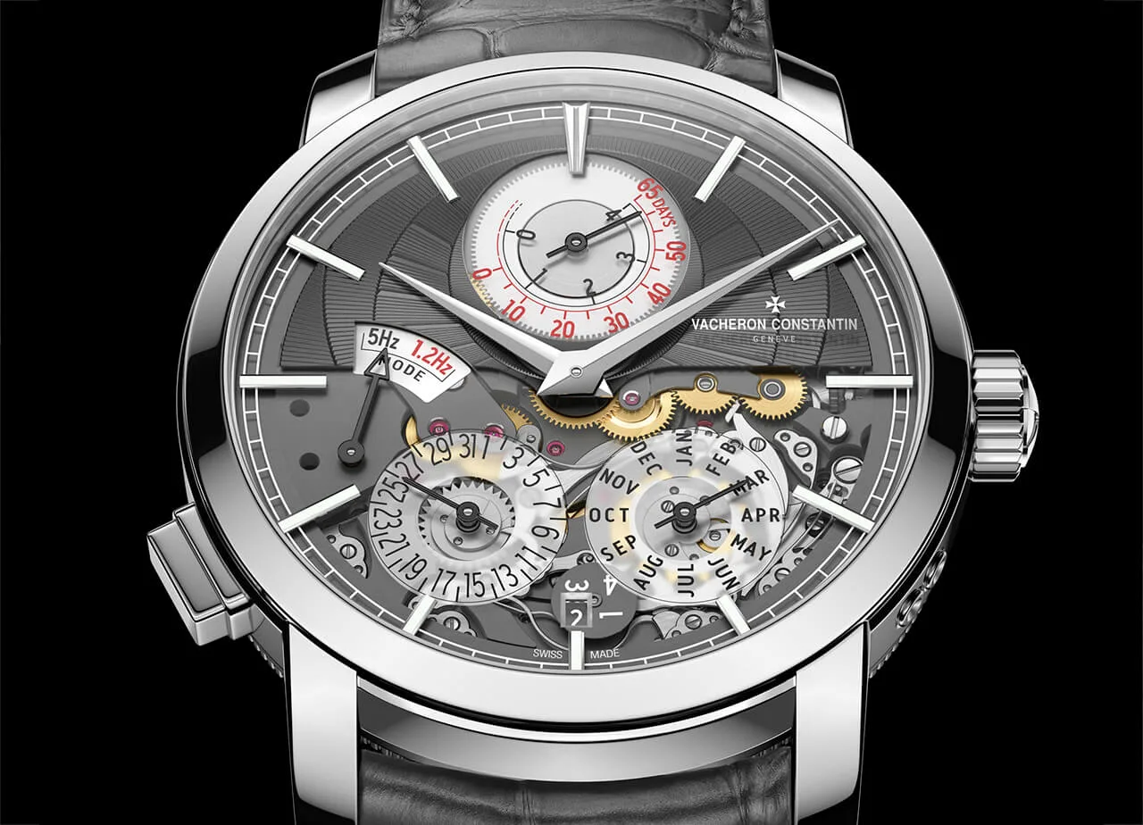 The dial on the Vacheron Constantin is finely executed and is basically divided into two halves. The upper half is beautifully decorated with an intricate hand done guilloche pattern and features a big circular power reserve sub-dial with black and red markings to indicate the high and low-frequency power reserve. The lower half of the dial has been kept open giving a nice view of the complicated internals and houses the frequency indicator at 8 with high and low frequency in black and red respective similar to the power reserve, a transparent looking date sub-dial between 7 and 8, a month sub-dial between 4 and 5, and the current year at 6. And finally, you have a nicely proportioned elongated dauphine style handset to track the hours and minutes using the applied hour markers and a railroad style minute track printed in white.