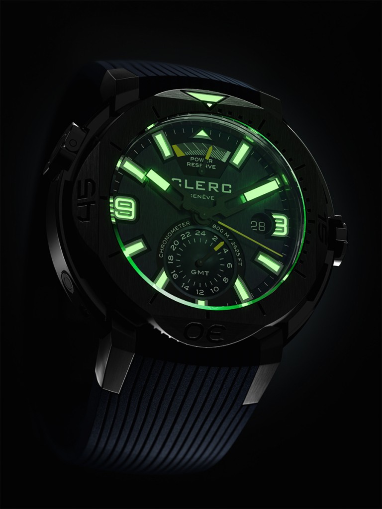 The new Hydroscaph GMT Power-Reserve Chronometer draws power from the in-house mechanical self-winding movement Clerc Calibre C610 which have been certified by the Swiss Official Chronometer Testing Institute (COSC) for its remarkable precision and reliability. It’s armed with a 42 hour power reserve which is perfect for long intercontinental travels considering that the movement also powers the dual time at the 6 o’clock. The lovely and exclusive movement with 31 jewels can also be viewed from the dual-porthole exhibition case-back which is simply stunning to observe.