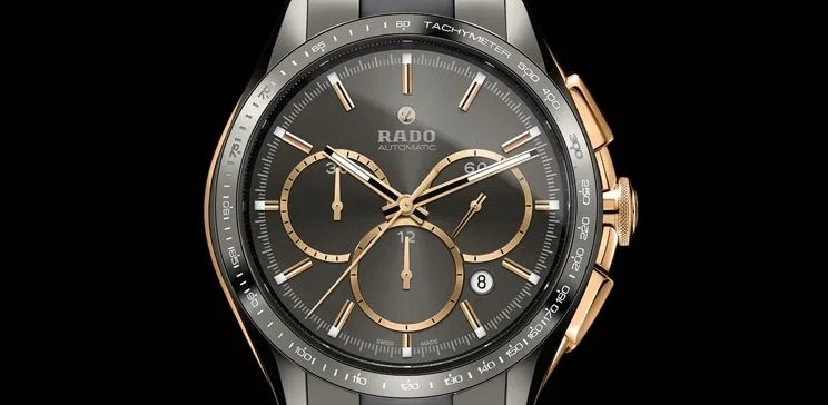 The dark grey chronograph dial is laid out in the conventional way with three sub dials for hour and minutes arranged in a V shape, Rado have added a touch of elegance to the piece by making the sub-dial rings, hands and hour applied indices in rose gold plated stainless steel adding a touch of warmth to the dark grey dial. Date window has been placed at between 4 & 5 O’clock so as not to obscure the sub-dials with black on white numbers. Both sides of the case have been coated in rose gold coloured PVD and so have both the pushers for the chronograph and the crown. The special shine of the plasma High-Tec ceramic maintains its sporty feel but also gives it an elegant look especially as over time the colour will never fade.