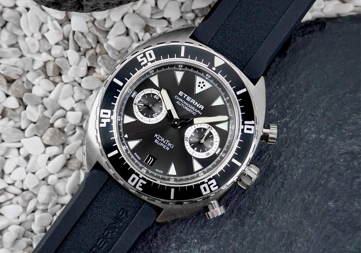 The new Eterna Super KonTiki Chronograph retains its diving capability with 200m limit and comes with either black rubber strap or metallic Milanese bracelet. For more info, please visit eterna.com