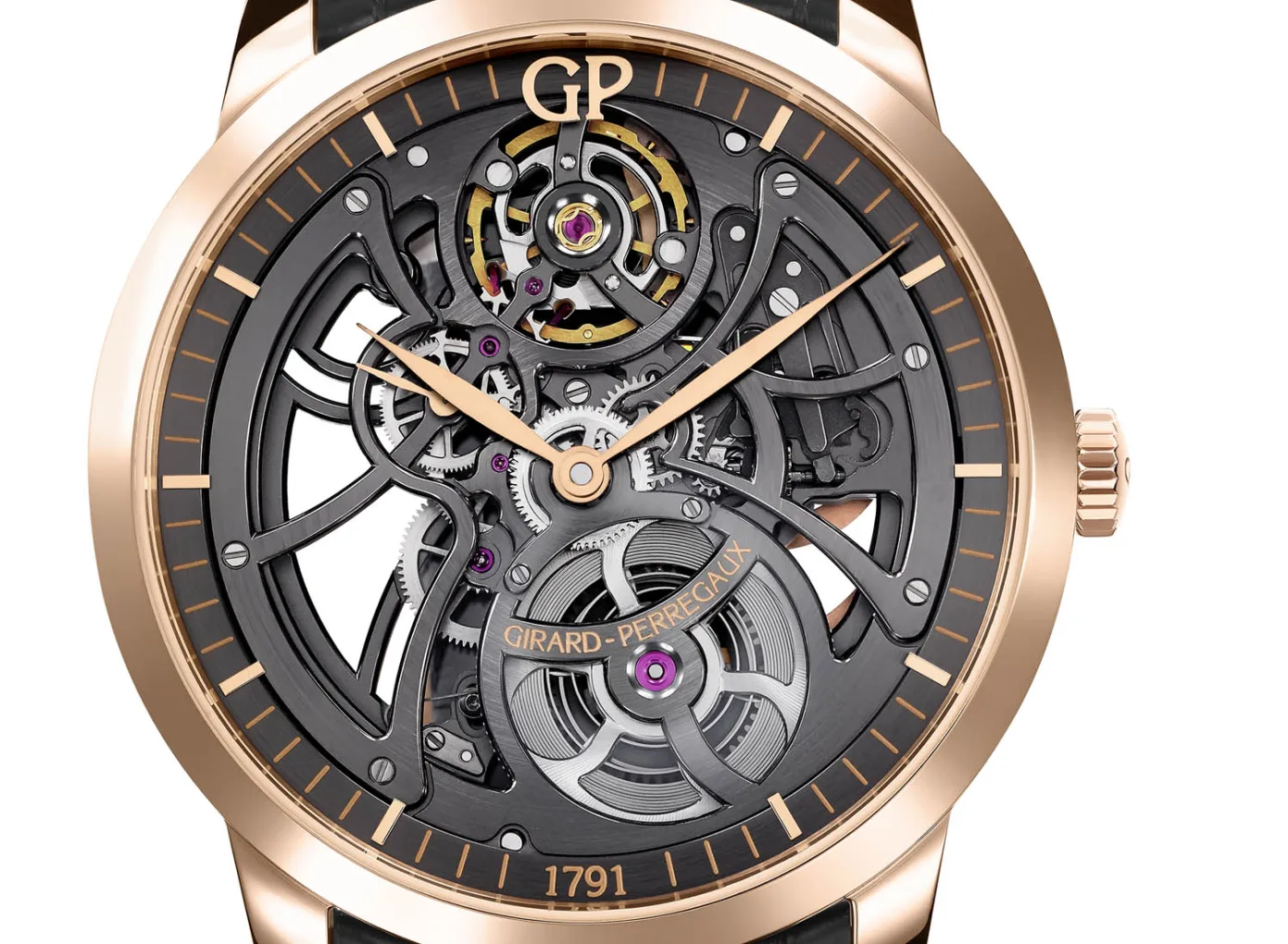 The skeletonization of the movement is done with subtlety and modernity in mind, with polished bevel angles on all the bridges and a concentric brushed finish on the top. The skeletonized GP1800 movement also appears as a sheen of gray because it has been treated with anthracite gray ruthenium using a galvanic process, providing a strong contrast to its pink gold case.
