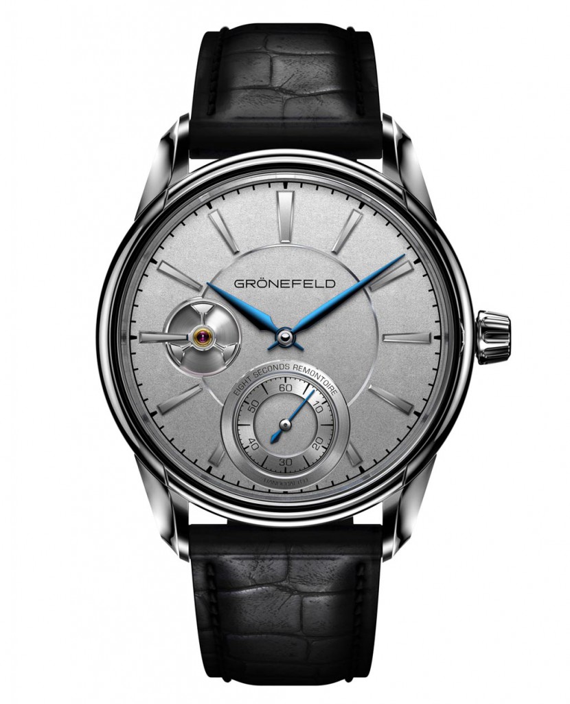 - Bridges: stainless steel, bevels polished by hand, micro-blasted centre, circular grain on the top rims to highlight the bridges shapes and engravings, bas-relief engraved Grönefeld logo, number of jewels and eight seconds remontoire