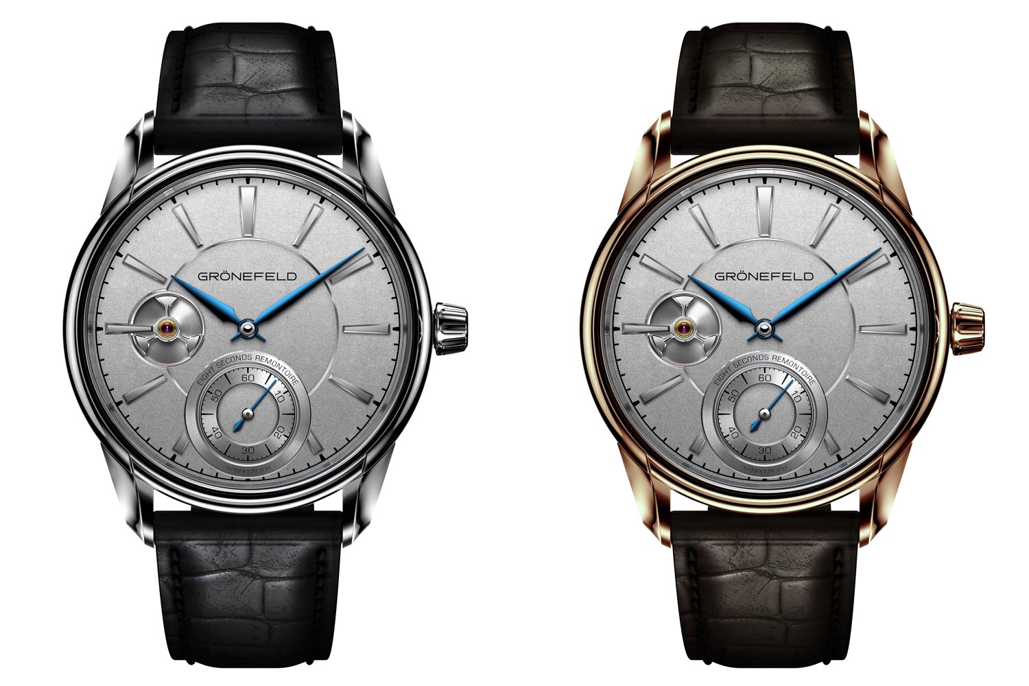 - Strap: hand-sewn ostrich leather with white gold or red gold buckle engraved with Grönefeld logo