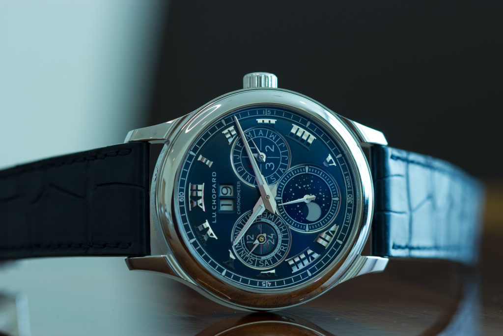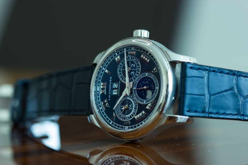 The new Lunar One also has new dial design which is now featuring applied Roman numerals. The sub-dials seem a bit squeezed but this is so that readability is enhanced. The moon phase and calendar complications, along with the big date aperture at 12 are nicely designed against a deep blue sunray dial. The polished metals are a fascinating combo of delicious watchmaker’s marvels, I like it. A thing to note here is that the sunray dial radiates from the Chopard logo which is located halfway at the 12 o’clock point, quite a unique approach.