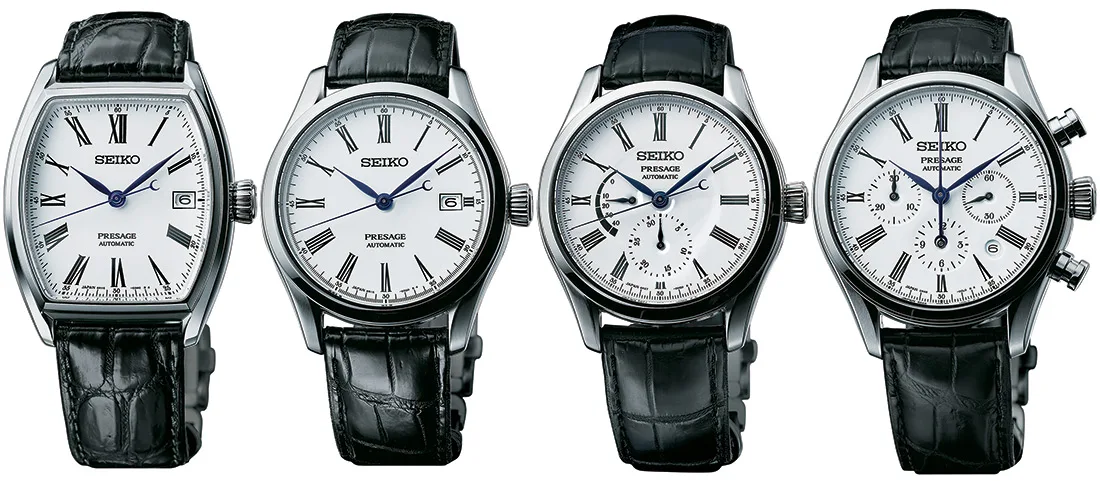 For Baselworld 2017, Seiko has announced that they will be releasing another range of watches in the Presage collection. The Seiko Presage Enamel Collection will, as the name suggests, be a whole collection of watches with the same enamel dials as the 2016 60th Anniversary Chronograph. This new range is based more on Seiko’s 1895 pocket watch, the “Timekeeper”. You can clearly see a resemblance throughout the whole collection with both watches having the enamel dial with very tall and thin roman numerals.