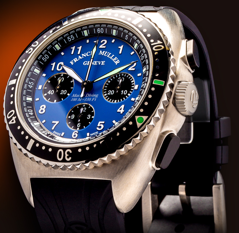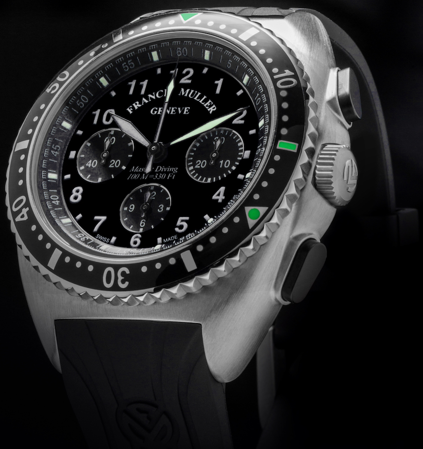 The new case on the Franck Muller master diving watch might not possess the refined silhouette of the Tonneau shaped case, but it does feature a bold new design with a raw and industrial look. Being 46.33 mm wide and 55.4 mm long this is certainly a large watch and would give people with a smaller wrists a tough time. Having said that, looking at the case profile in the press renders, the curved case design should for sure provide some wearing comfort once you have the watch strapped on your wrist. Being a diver there is a 60minute diving bezel on top of the case and the lumed bezel insert should help time those dives quite easily. The right side of the case is flanked by a screw down crown at 3 and chunky looking pushers at 2 and 4 to control the chronograph functions of the watch. Water resistance is marked at 100 meters, which given the screw down nature of the crown might be more than adequate for most of the people out there, but is definitely on the lower side of the scale , especially for a “Master” dive watch.
