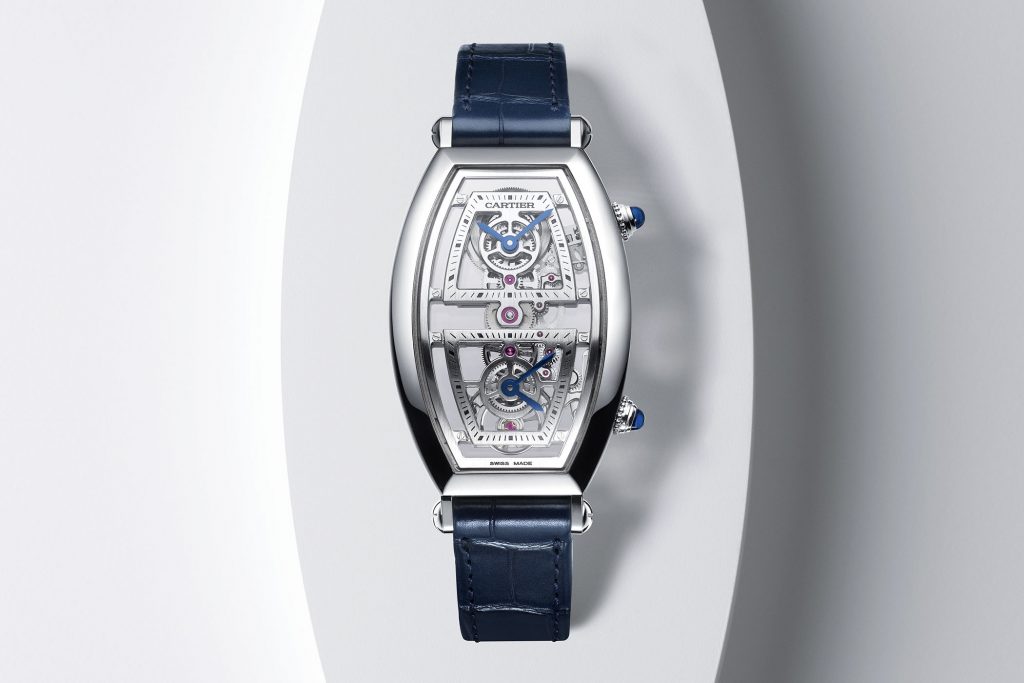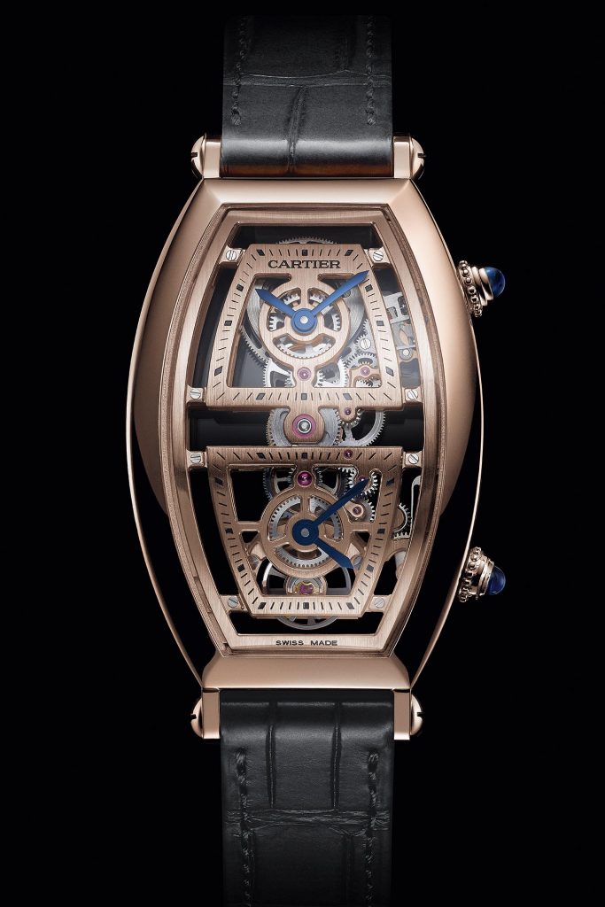 The skeletonized watches is Cartier’s tribute to the Tonneau XL dual time zone and in order to remain true to the original shape of the case, the 9919 MC calibre has to be adapted. All the wheels of the geartrain had to be aligned between 12 and 6 o’clock and then curved to fit the Tonneau watchcase.