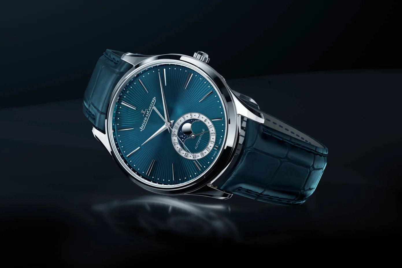 The dial has an excellent sunburst guilloché pattern radiating out from the centre, covered by a blue translucent enamel which makes it sparkle. We see here in this piece a demonstration of Jaeger’s artistic crafts skills. The JL logo has been applied to the dial, along with the hour indices for a luxurious appearance, which ties in with the upscale modern theme the watch is going for here. The moonphase is crisp and pretty, surrounded by a light silver date ring which adds a nice contrast to the piece that breaks up the blue. Â