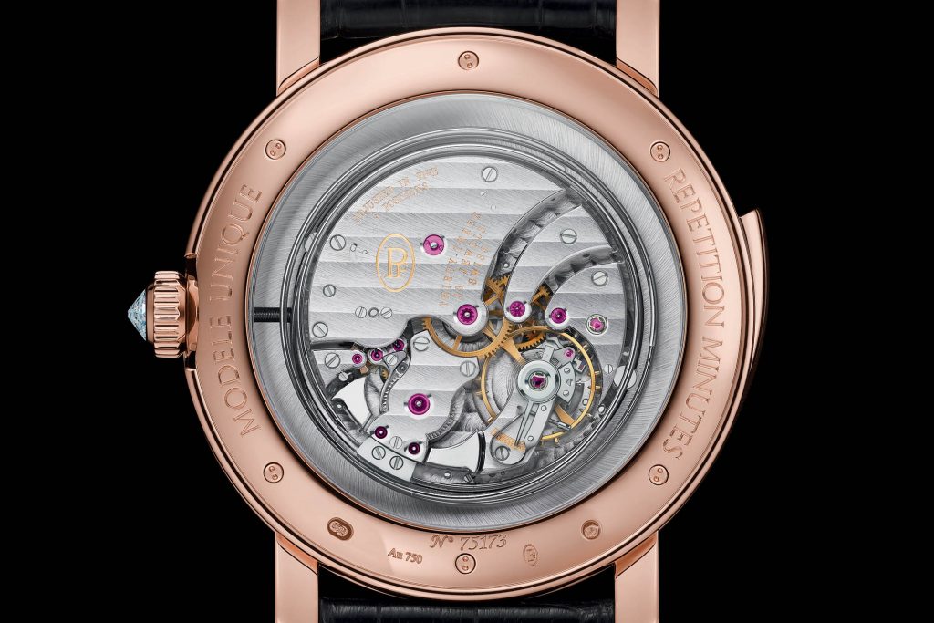 Like most of Parmigiani’s repeating calibres, the hand-wound PF321 is packed with a 40-hour power reserve and was inspired by pocket watch movements and has an appropriately classical bridge layout and is paired with a match brown alligator strap.