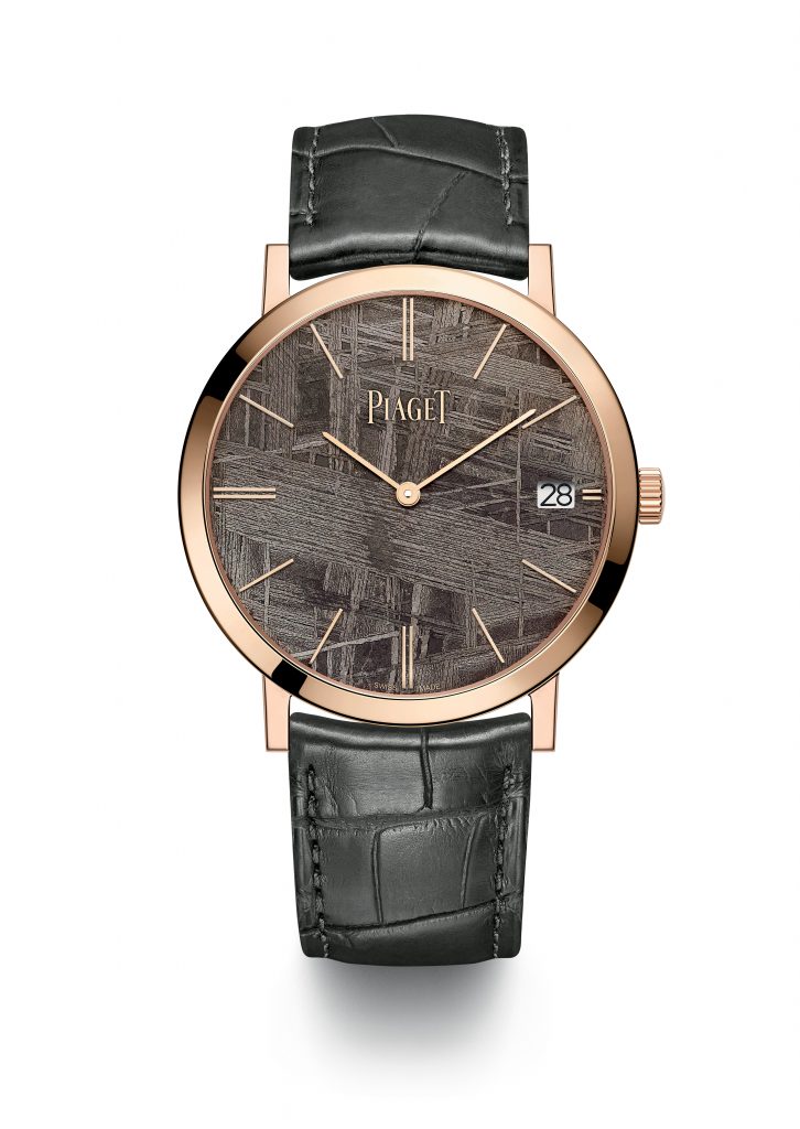 The second piece in the Altiplano collection is for the gentlemen. The Altiplano ref. G0A44051 is a modest 40mm in diameter, crafted of 18k pink gold and an ultra-thin beauty. Here the focus is on the grey dial, which is made of a meteorite, that crystal formation is unique to that single piece so that every watch will have a different pattern on the dial. Inside the svelte case is the automatic winding 1203P movement, which will run for 44 hours at a beat rate of 3Hz. At 3mm thick it’s not as thin as the 430P calibre found in the previous watch, but it does have a date feature along with that rotor. I don’t think anyone will mind this, though, that’s if they are lucky enough to be able to get hold of one, these watches are also limited, but there will be 300 of these.