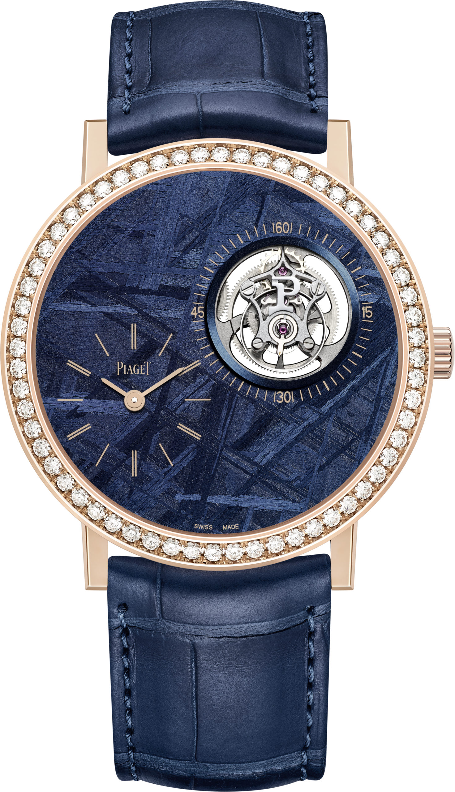 Finally, we’ve saved the best until last. The Altiplano Tourbillon ref. G0A44053 is a thing of beauty, a watch which is powerful when observed carefully, but still subtle. It would be even more subtle if it didn’t have diamonds on the bezel, but that goes against the whole ‘gem-setting’ philosophy I mentioned earlier. The calibre 670P inside this watch is amazingly thin at just 4.6mm. The off-centred flying tourbillon has a P and a ‘Lucky 8’, a Piaget signature (I couldn’t see it myself, but I’ve only got the press pictures to work with for now). The movement itself is made up of only 157 components in total, with 23 jewels and a beat rate of, you guessed it, 21,600vph, or 3Hz. As if this diamond and blue watch isn’t pretty enough as is, the dial is made up of meteorite just like the G0A44051  above. This will be a limited edition watch, with only 28 examples worldwide.