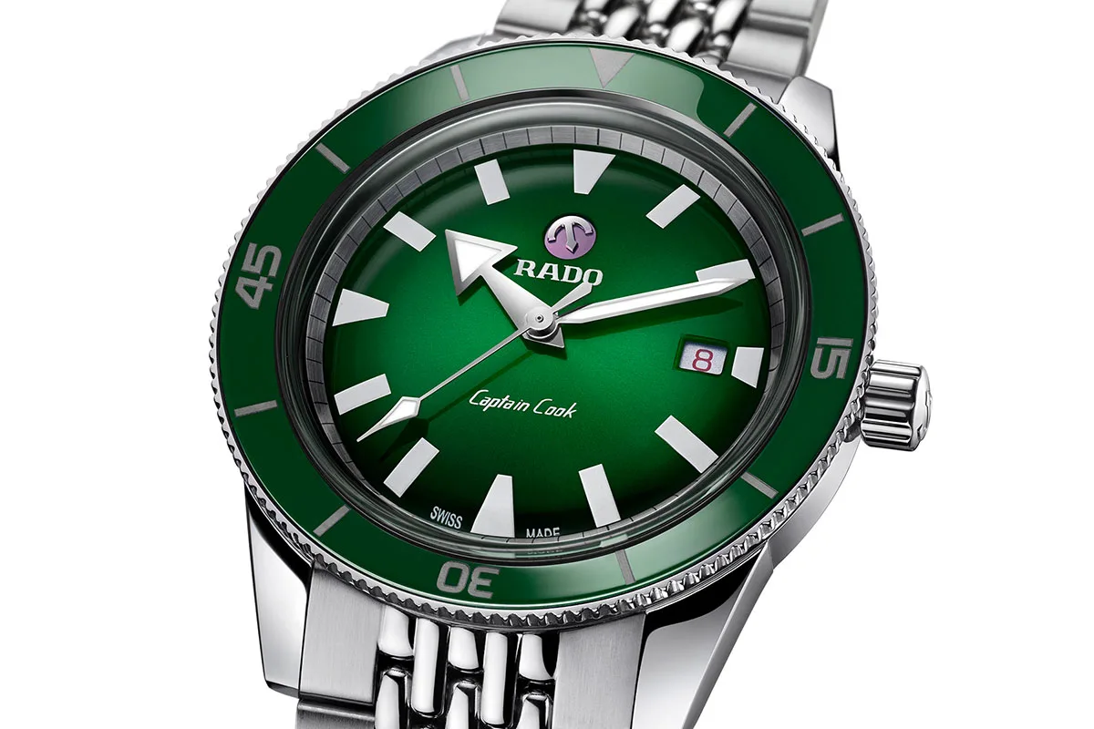 Not so long ago a nice shade blue was considered a refreshing change amidst the sea of watches with black dial that exists out there. But people today are more willing to take their chances and try something unique and brands are responding well by producing watches such as the Rado Captain Cook featured here. The dial on this watch has been rendered in a rich shade of green and is a visual treat courtesy of the fume treatment. It starts with a lighter tone at the center and gradually darkens moving outwards to finish with an almost blackish color at the outer periphery. Apart from the change in color, the dial layout remains virtually unchanged. You still have the chunky printer hour markers (painted in white), the bold broad arrow handset and a red date wheel, all of which combine to offer the wearer a delectable vintage-inspired experience.