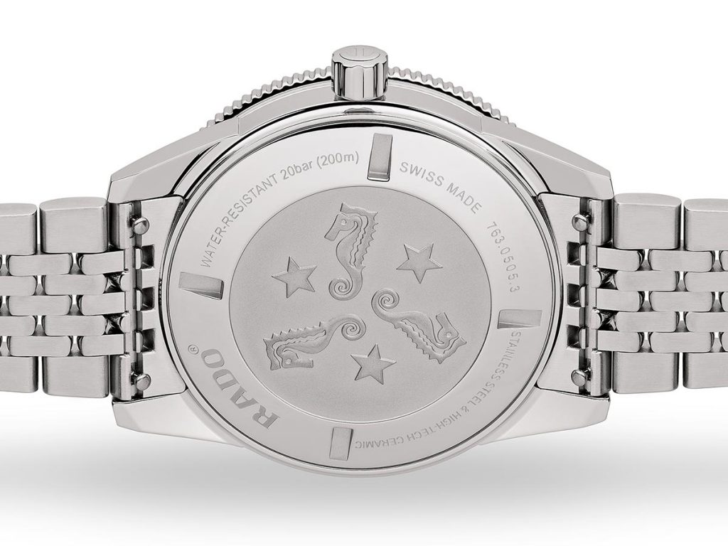 Flipping the watch over you will find a closed case back which has been nicely decorated with embossed motifs of stars and sea dragons. The case is water-resistant to 200 meters which ensured by the screw-down crown at 3. Driving the watch is the ETA caliber C07.611. This is an automatic movement that operates at a frequency of 3 Hz and offers a power reserve of 80 hours.