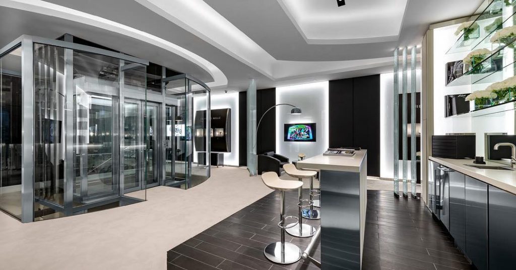 The surprises don’t end there as clients are greeted with a custom build elevator in the centre of the store. The lift is transparent and much like a Richard Mille watch provides a full view of the elevators inters mechanics allowing clients to wonder over the moving parts and mechanism at work as they get transported to the mezzanine level. Much like a watch case which is mixed with brushed and polished surfaces, the elevator is encased in curved, three-layer glass panels while the shaft is illuminated, ultimately creating the appearance that the elevator is floating up and down within the store.
