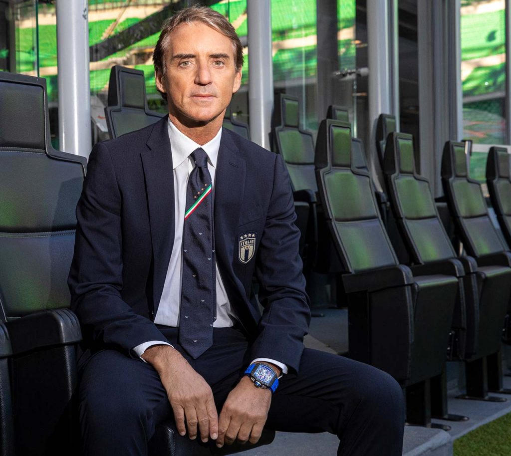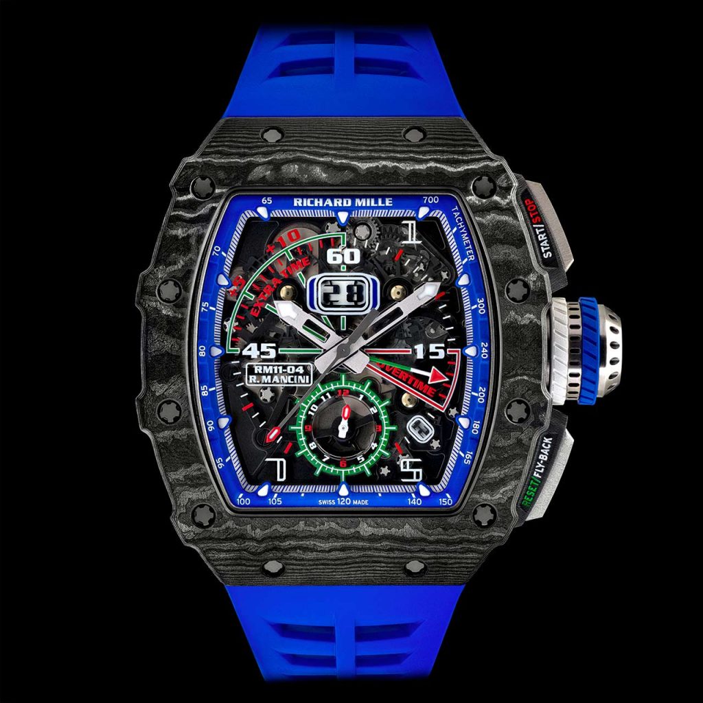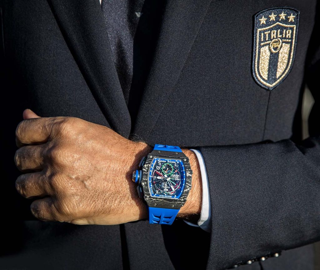 Richard Mille is known for doing two things, making extremely high end watches with intelligent designs using innovative materials and also partnering with just about anyone of influence to make their watches. This time, the new RM 11-04 Automatic Flyback Chronograph is strapped to the wrist of Roberto Mancini, the manager of the Italian national football team. For our readers from the USA, ‘soccer’ is the type of football played, rather than American football. Games will typically last 90 minutes with added time if needed. Roberto Mancini has worked with Richard Mille before to create a chronograph watch that can effectively and accurately time a match, but now he’s back working with Richard Mille to create this new and more colourful version.