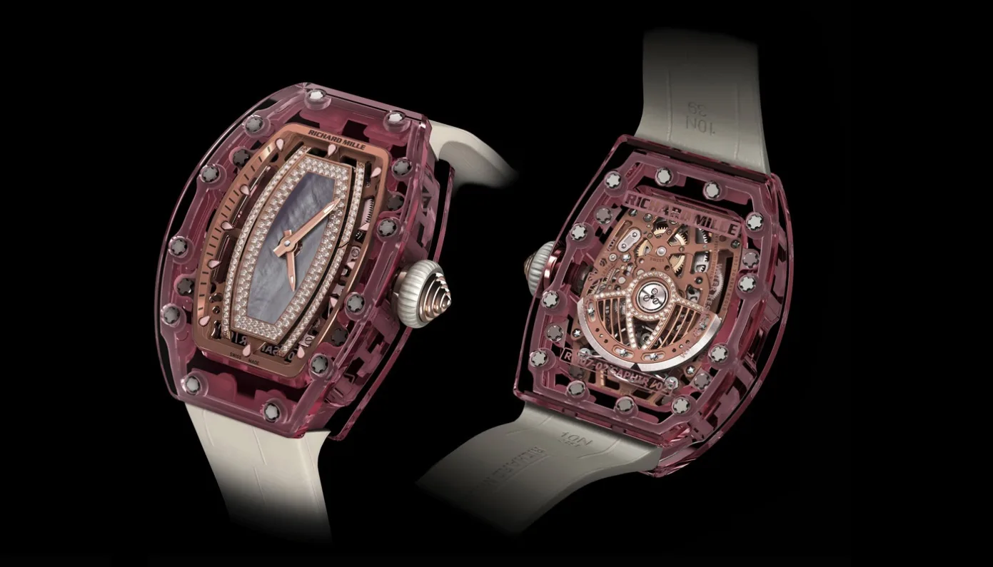 Richard Mille has now added one more masterpiece to their collection of ultra-luxury timepieces for women – the Richard Mille RM 07-02 Pink Lady – which was produced from a case almost entirely crafted from synthetic pink -colored sapphire crystal.