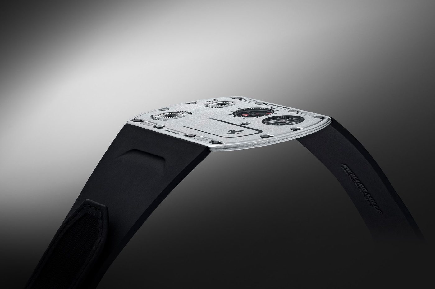 Unlike the prior two record holders, the overall appearance is rather unconventional (head on, anyway). It has a wide rectangular form with rounded sides (a tonneau shape) and the time aperture is very small in relation to the overall watch face. Hours and minutes sit in a central sub-dial at the top with the exposed balance at right, both protected with sapphire crystals. The watch celebrates a partnership between Richard Mille and Ferrari that started in 2021, so the Italian carmaker’s logo is naturally (and prominently) at the bottom.