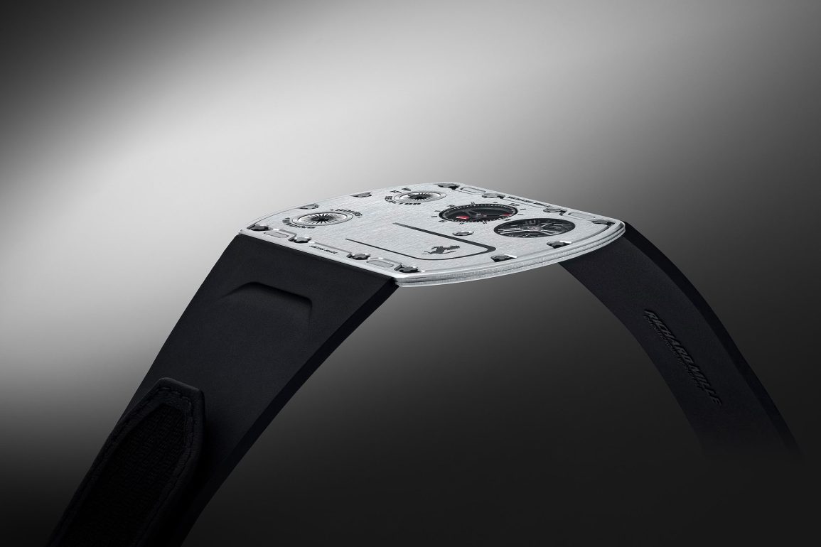 Unlike Bulgari’s and Piaget’s approach to designing ultra-thin movements, the case back doesn’t act as a baseplate. Richard Mille’s 1.18mm hand-wound RM UP-01 caliber is independent like a traditional movement, installed into the case instead of being integrated. The case is held together by 13 spline screws, which also secure the movement. The balance wheel and escapement had to be rethought to make it flat enough.