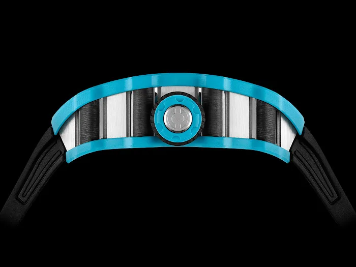 This unique blend not only looks incredible but also delivers exceptional strength and lightness. The case’s curved lines and angular edges create a futuristic silhouette that’s unmistakably RM.
