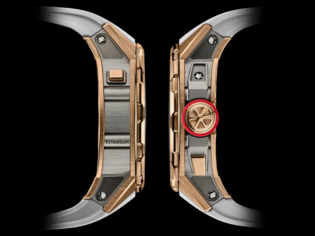 The 47mm x 13.45mm round case is satin finished in 5N red gold with polished bevels, while the bezel is microblasted 5N red gold. The grade 5 titanium caseband keeps things grounded, the twelve titanium spline screws hold the structure together, ensuring 30 metres of water resistance. A burgundy Alcryn collar wraps the crown for that soft yet resilient grip. A push button at 4 o’clock selects Winding (W), Neutral (N), or Hand setting (H), displayed in a small aperture.