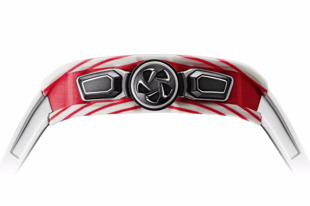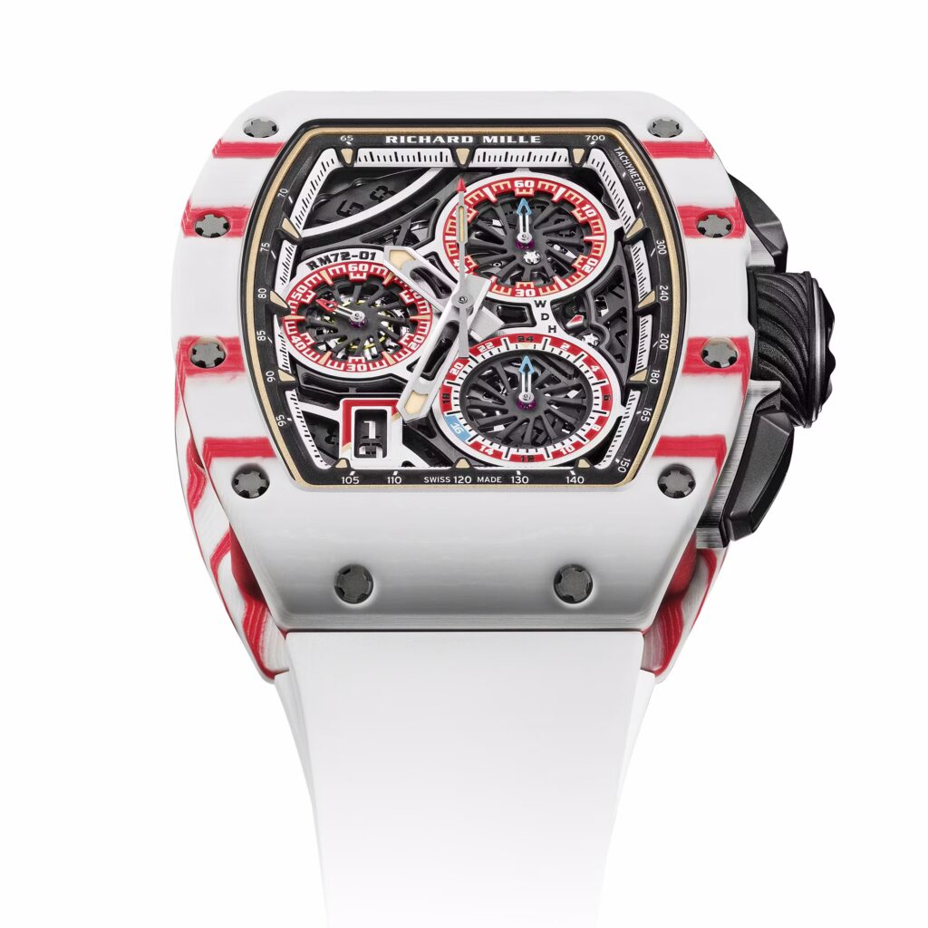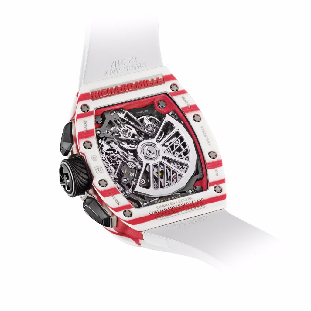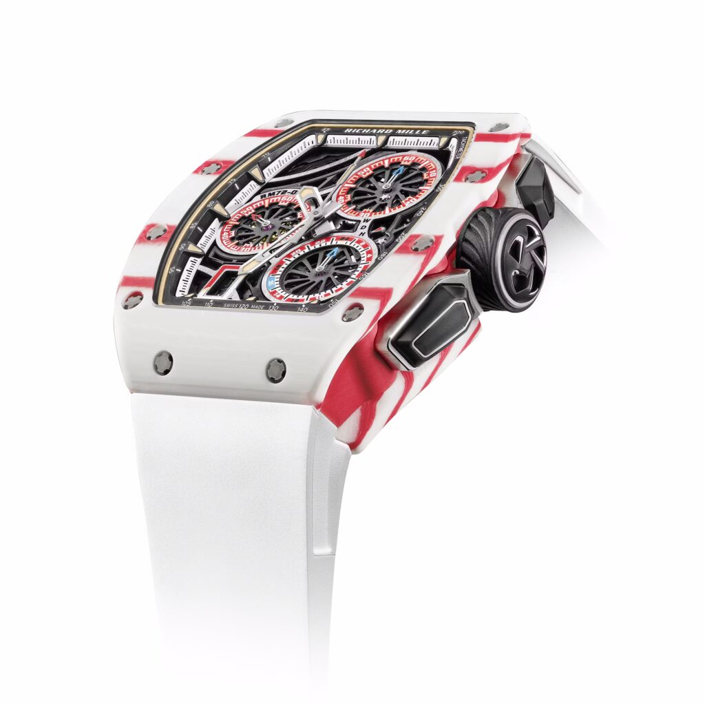 Wrapped in white Quartz TPT with streaks of red like speed lines in a comic book, the case is an ode to Leclerc’s homeland flag. It’s sized at 38.4mm x 11.68mm, though those numbers hardly capture its wrist presence. Lightweight yet brawny, the caseband carries on the color story, while the crown, resembling a tire under hard acceleration, feels like a sly nod to the F1 grid.
