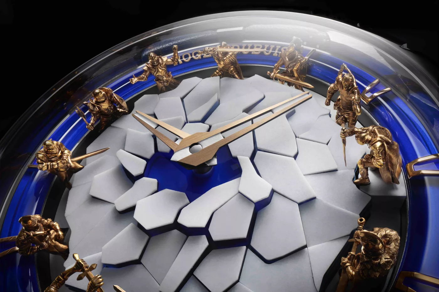 These watches are based on Arthurian legend which hails from 12th century Britain and France. King Arthur established the Knights of the Round Table to ensure peace in his kingdom, and the table plays host to all members of society, from royalty to minor nobility; everyone sitting at the Round Table is equal. This new piece depicts the Knights as they encounter a mysterious new challenge in an icy tundra. Despite being statues, the figures have very dramatic poses making them seem to be alive, as if they’re waiting for the monster below the ice to reveal itself. Each knight is 6mm tall and made of 18k pink gold, and the engraving of their details is done by hand.
