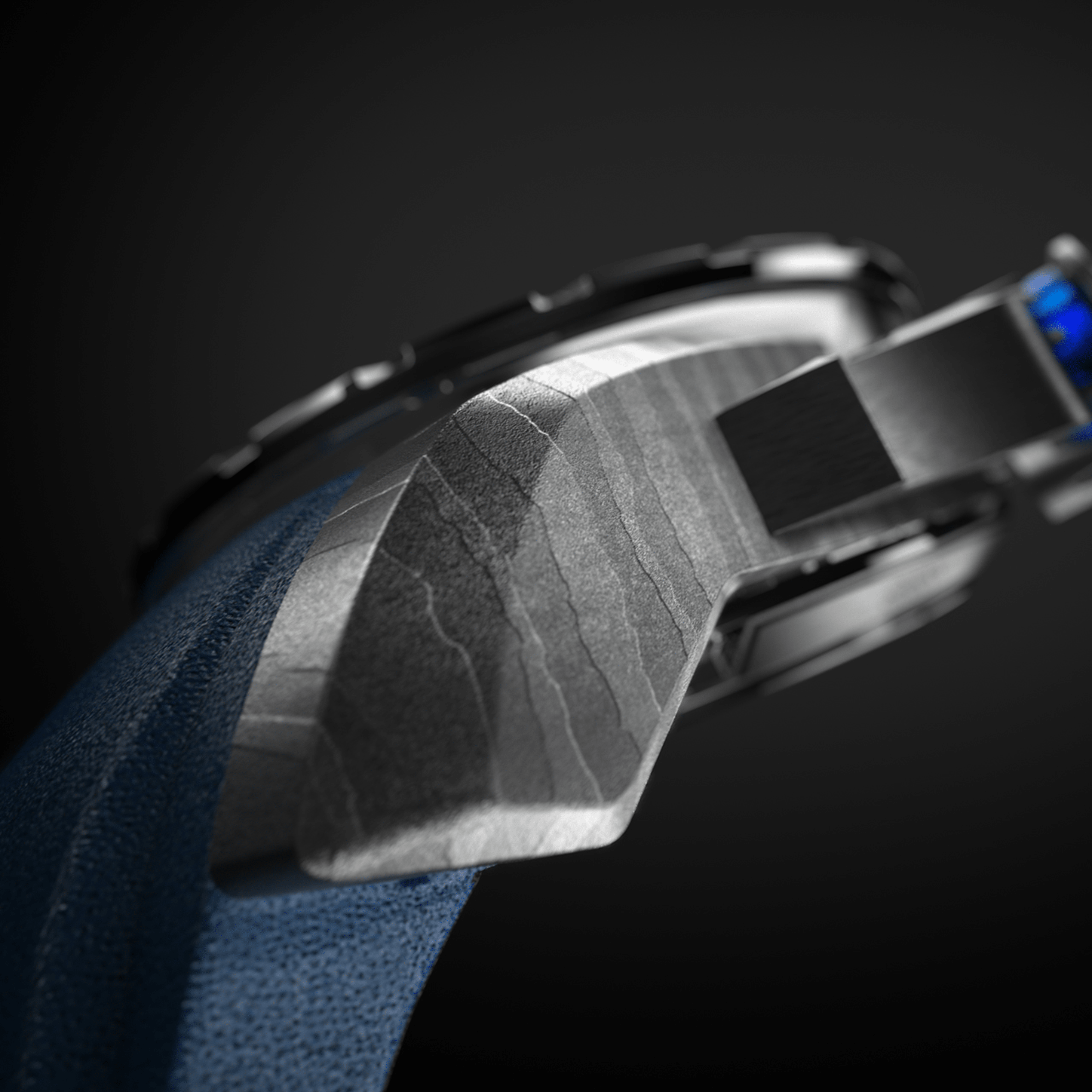 The case is also an intriguing proposition. It’s 45mm in diameter and it’s gonna be thick, although Roger Dubuis hasn’t told us precisely how thick in this instance. It will be lightweight, though, as the case is made of Titanium Damascus. If you’re familiar with Damascus steel and its appearance made of many layers which have fused together, then this will be pleasingly familiar.