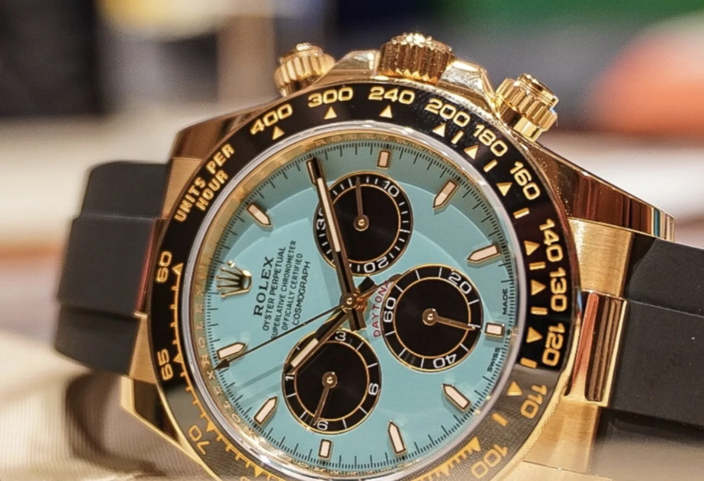 Rolex took the Daytona and gave it a face-lift that nobody quite expected. The 40mm case is yellow gold, but the dial is the real kicker: glossy turquoise, with black subdials and gold surrounds. It’s not meteorite or opal, just a bold lacquered finish that won’t be to everyone’s taste.It runs on the Calibre 4131, an automatic chronograph movement with 72 hours of power reserve and Rolex’s latest Chronergy escapement. This reference comes on a black Oysterflex rubber strap with a yellow gold clasp. It is a standard production piece, not limited, and expected to retail around 35,500 USD. Availability, as always, is an entirely different question.