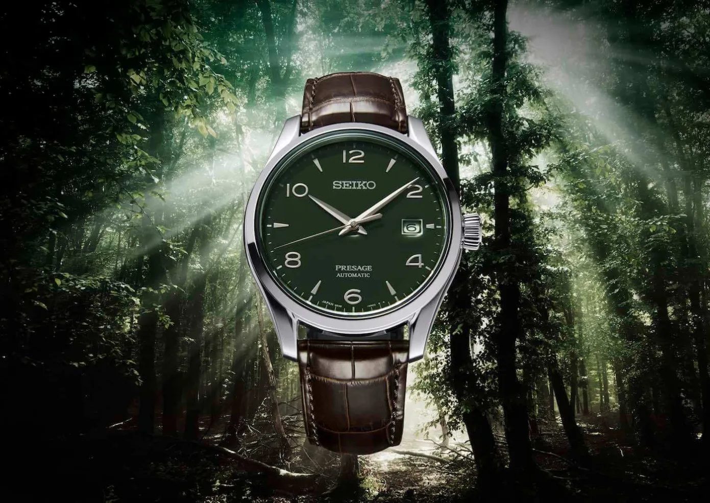 The new Presage watch features a verdant green dial to evoke the cedar trees that grow around central Japan. In case you didn’t know, quite a lot of the Japanese territory is mountainous or otherwise tricky to habituate, which is why the cities tend to be extremely crowded. Nevertheless, there’s plenty of flora and fauna to see in the mysterious nation. Applied to the green enamel dial are a combination of markers and numerals which are shaped to resemble the leaves of the cedar tree somewhat. The dial is very minimalistic, with elegant dauphine hands completing the look. You can see a dip in the dial around the hands and the date window which uses a green font that matches the dial.