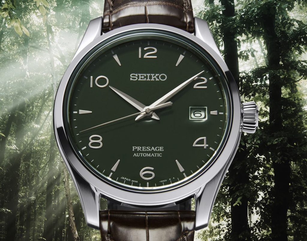The new Presage watch features a verdant green dial to evoke the cedar trees that grow around central Japan. In case you didn’t know, quite a lot of the Japanese territory is mountainous or otherwise tricky to habituate, which is why the cities tend to be extremely crowded. Nevertheless, there’s plenty of flora and fauna to see in the mysterious nation. Applied to the green enamel dial are a combination of markers and numerals which are shaped to resemble the leaves of the cedar tree somewhat. The dial is very minimalistic, with elegant dauphine hands completing the look. You can see a dip in the dial around the hands and the date window which uses a green font that matches the dial.