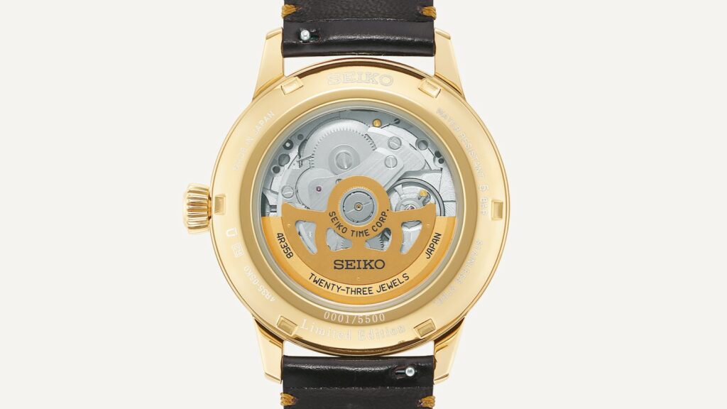 Like many previous iterations of the famous ‘Cocktail Time’ Presage watches, the highlight of the SRPH78 is its stunning textured dial. The light golden hue of the dial evokes Japan’s golden natural environment, which is dominated by ears of rice, a raw material used in the production of Sake, a major ingredient of the “Houjou” cocktail. Placed on top of the dial are polished and faceted golden hour markers that add to the dressy nature of this timepiece. The dauphine style hour and minute hands and the stick style seconds hand have also been presented in a golden tone. To provide a nice contrast to the golden background, and, to enhance legibility, the minute track is printed in black.