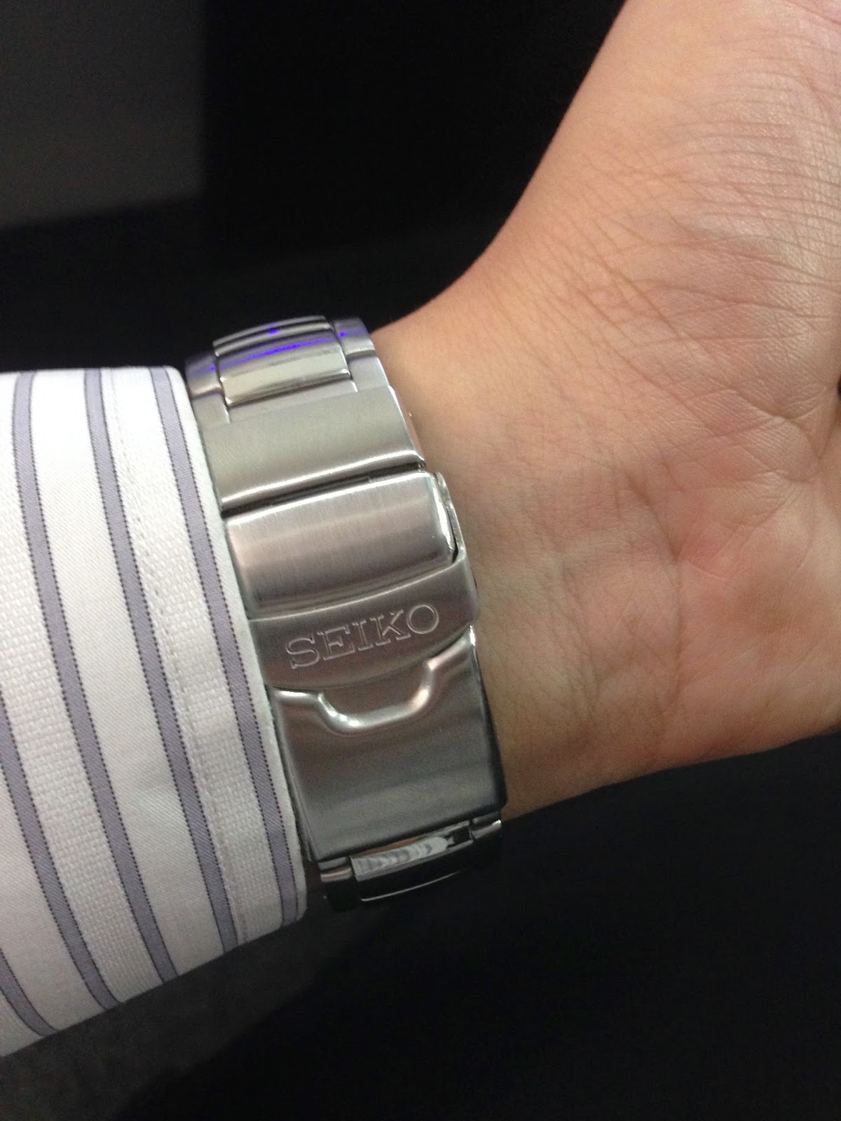 The classic clasp of a Seiko bracelet with the simple diver extension system above it. Simple, practical and safe.