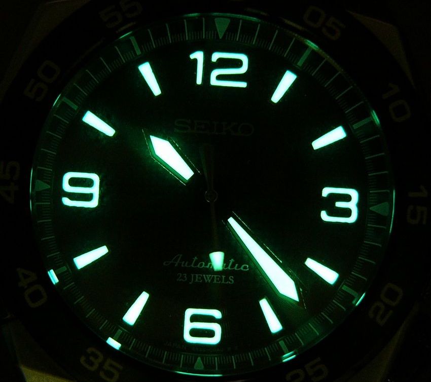 This watch comes with a date function. Instead of substituting one of the indexes to be the date window, a standalone date window is located at the 4:30 position. I prefer this placement as none of the lumed indexes or numbers is eliminated. For a lumed shot, you get the full effect instead of gaps.